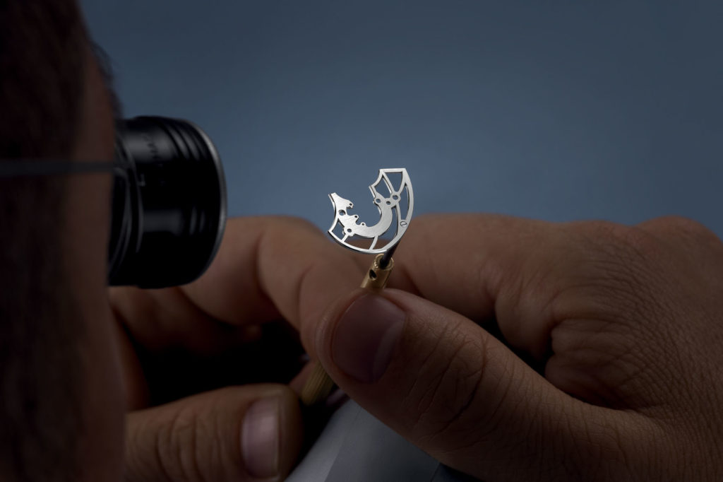 Attraverso i ponti scheletrati, spazzolati, satinati e sabbiati, il fondello in vetro zaffiro rivela parte del calibro Automatico 2952 con 65 ore di riserva di carica. La massa oscillante scheletrata in oro 22 carati color rodio si abbina al colore della cassa e dei ponti.