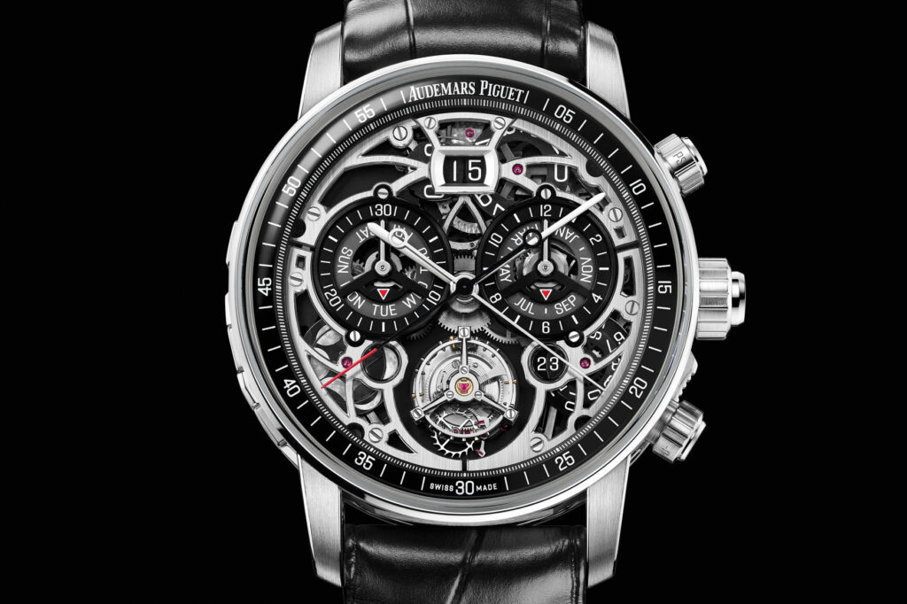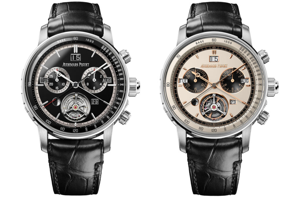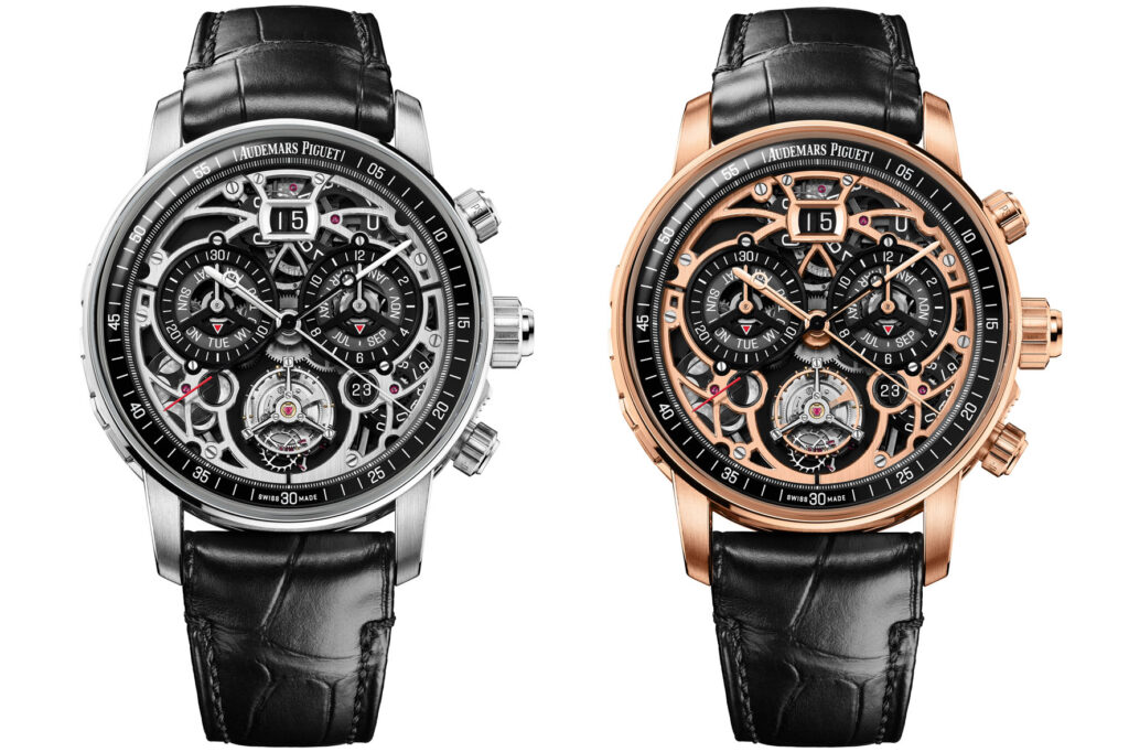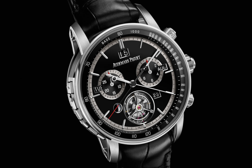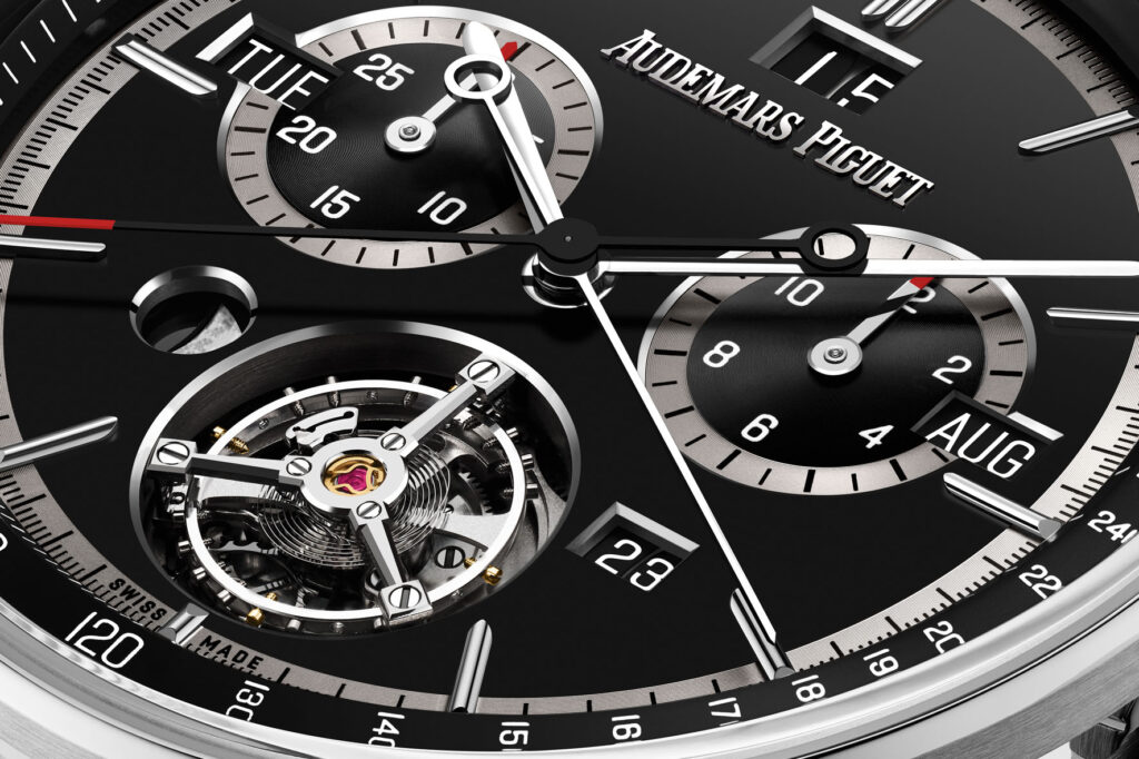 Il primo segnatempo combina una cassa in oro bianco 18 carati con quadrante in oro galvanico nero opalino, réhaut e contatori cronografici illuminati da accenti luminosi. La gabbia del flying tourbillon a ore 6, che rivela l’organo di regolazione color rodio che pulsa al suo interno, riprende le zone esterne color grigio chiaro dei contatori cronografici e la zona intorno al quadrante, su cui sono state trasferite la scala dei minuti nera e l’indicazione Swiss Made. Gli indici e le lancette applicati in oro bianco nonché la firma Audemars Piguet applicata e ottenuta con accrescimento galvanico amplificano il gioco di luci.