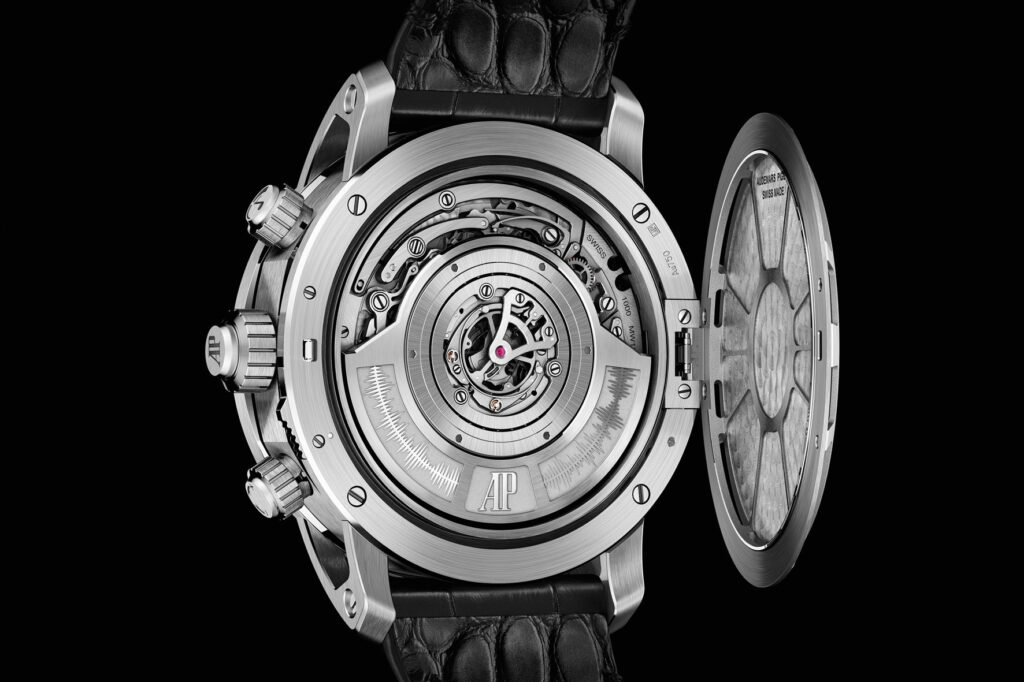 Il coperchio “segreto” presenta una serie di aperture laterali che lasciano passare l’aria e aumentano l’amplificazione del suono quando l’orologio viene tenuto al polso. Inoltre, è stato scavato per mantenere il minor materiale possibile e ridurre lo spessore generale della cassa. Questo coperchio girevole può essere aperto grazie a una leva discreta situata proprio sotto la corona a ore 3 sul lato posteriore per ammirare il meccanismo del rattrappante e la massa oscillante in platino dedicata. Infine, la massa oscillante sfoggia una serie di raffinate tecniche di finitura, tra cui le onde sonore incise che rimandano alle eccezionali prestazioni acustiche del segnatempo.