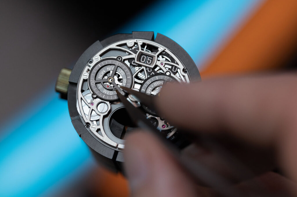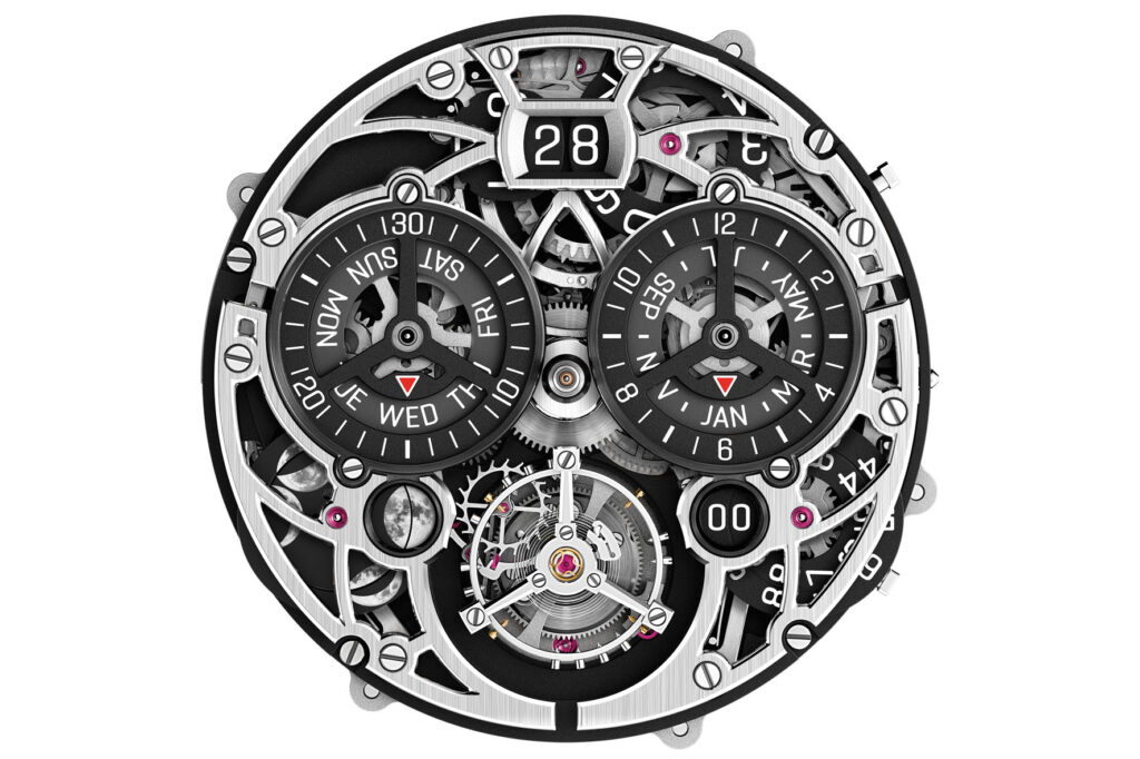 Infine, per migliorare la leggibilità delle funzioni cronografiche, i contatori delle ore e dei minuti sono stati ingranditi e leggermente decentrati rispetto all’asse delle ore 3 – 9 per essere più distanti dalla gabbia del flying tourbillon a ore 6.