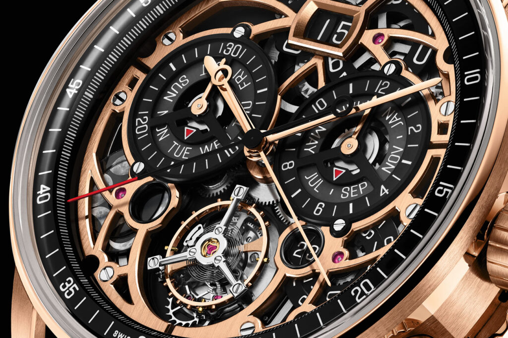 La Manifattura lancia anche due modelli che lasciano intravedere, sul lato del quadrante, i componenti rifiniti a mano del Calibro 1000. I due segnatempo presentano una cassa in oro bianco o rosa 18 carati e un quadrante architettonico in due tonalità con ponti scheletrati in oro, a contrasto con accenti neri. Per enfatizzare le geometrie multisfaccettate del quadrante, il giorno e il mese sono ora indicati in una zona grigia al centro dei contatori cronografici neri parzialmente scheletrati. Il vetro zaffiro a doppia curvatura della collezione accentua i giochi di luce creati dall’estetica in due tonalità del quadrante e del movimento.