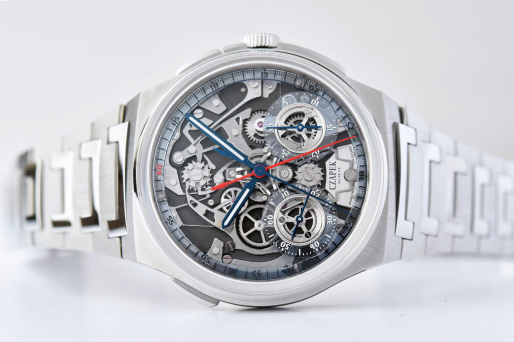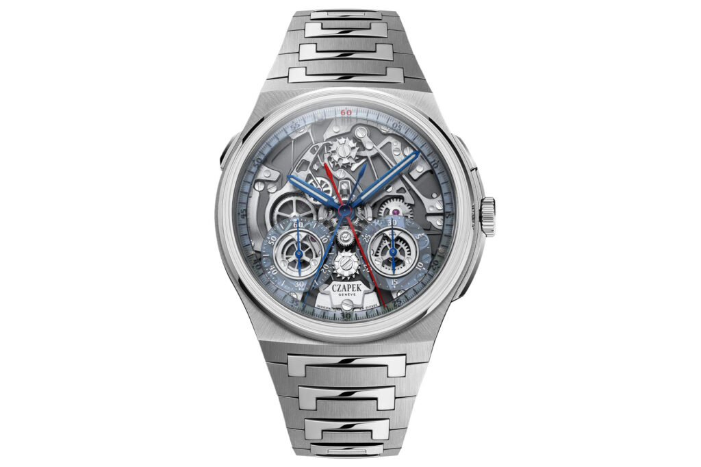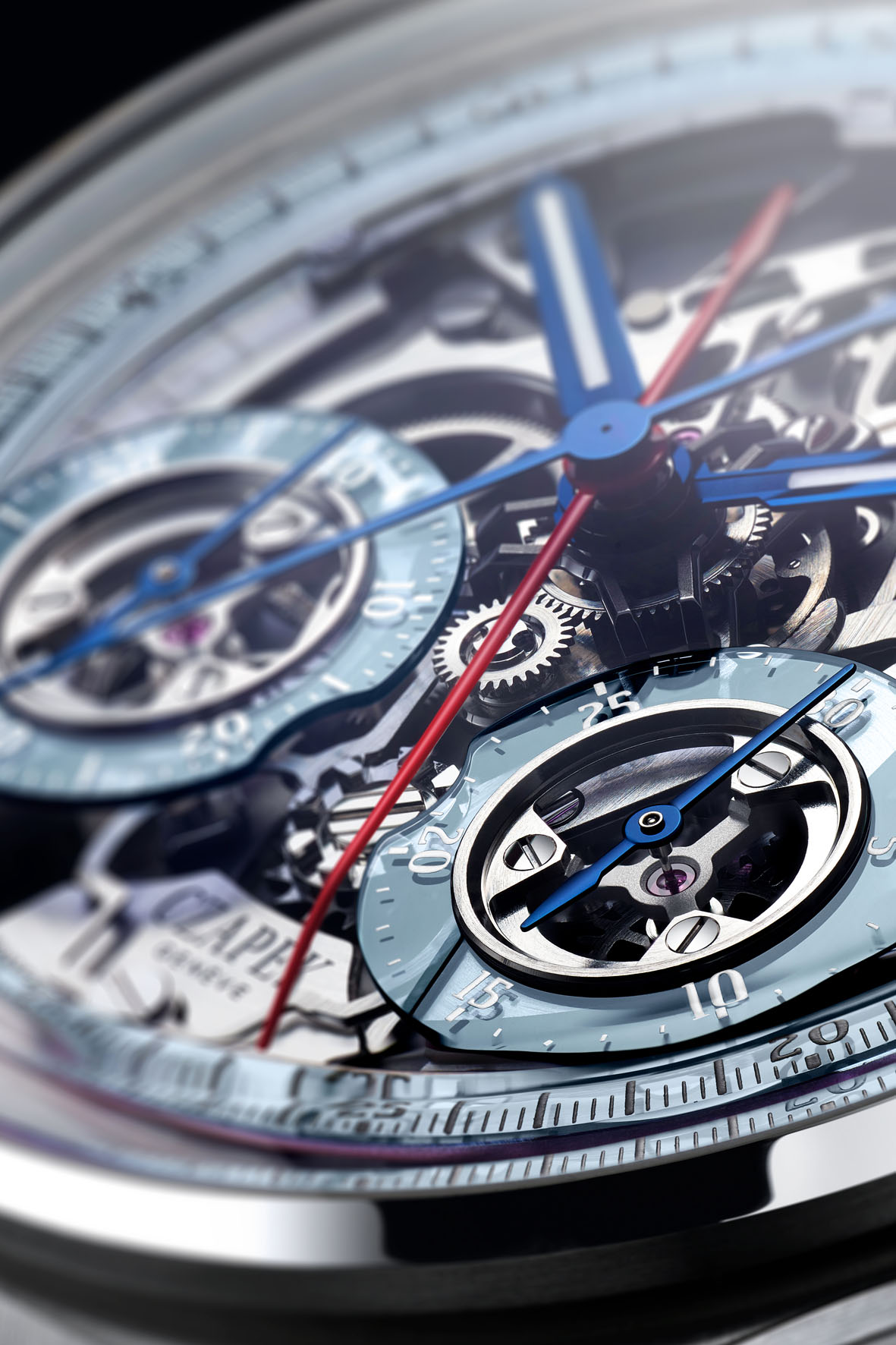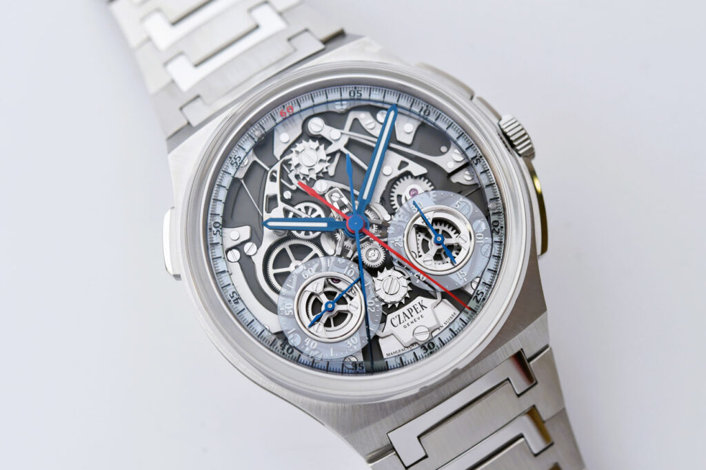 Ad animare il nuovo Antarctique Rattrapante Ice Blue è il calibro SHX6 di Czapek. Questo movimento proprietario ad alte prestazioni, creato in collaborazione con Chronode, è un’opera d’arte sia meccanica che estetica. “Il meccanismo rattrapante funziona grazie all’energia ricavata dalla seconda ruota”, spiega Xavier. “In questo movimento, abbiamo preferito un innesto orizzontale piuttosto che verticale per evidenziare l’estetica della trasmissione”. Inoltre, per garantire l’aspetto aerodinamico dell’orologio, il numero di parti e il loro spessore sono stati ridotti al minimo, per poterli inserire nella cassa di 42,5 millimetri in acciaio.