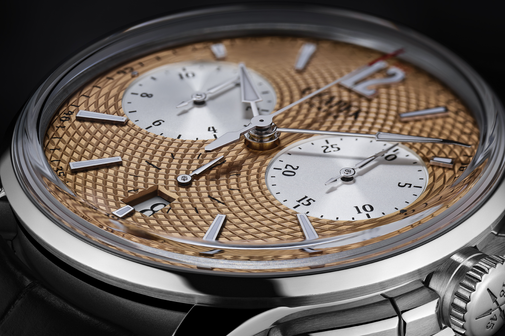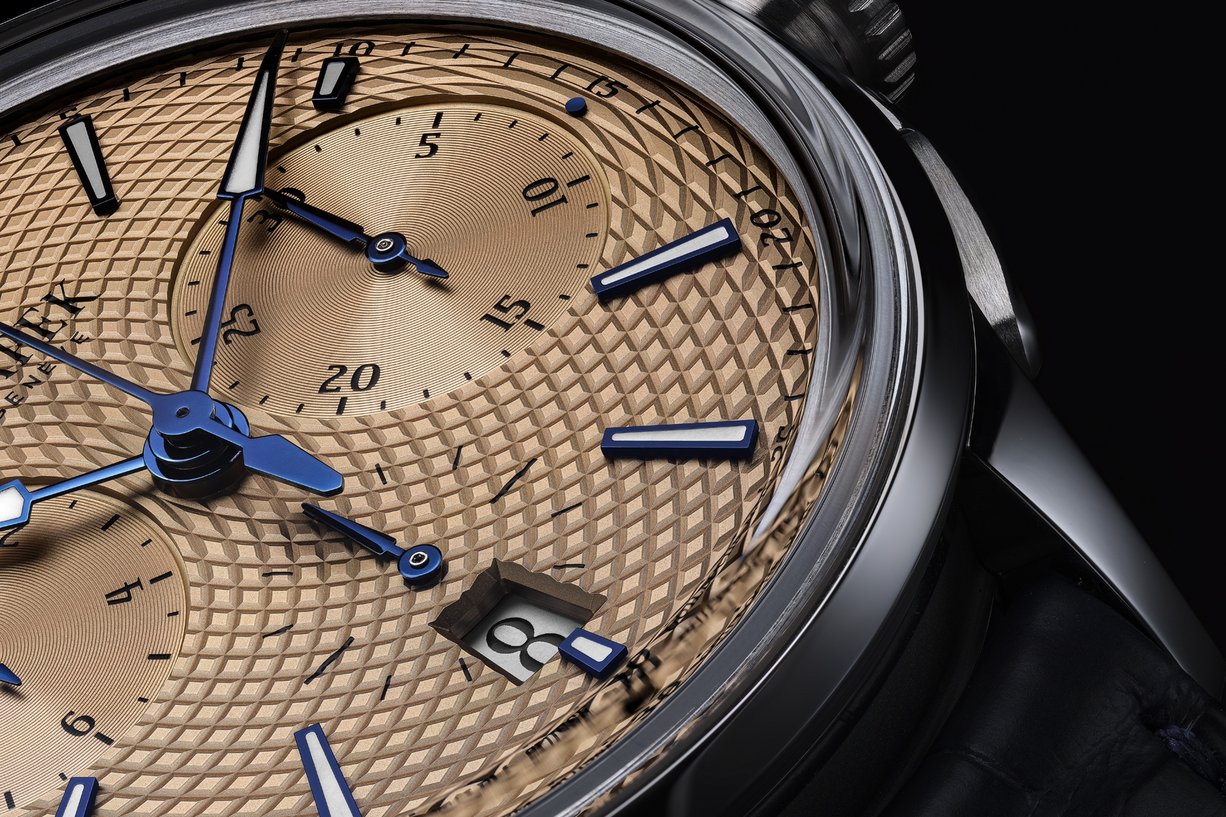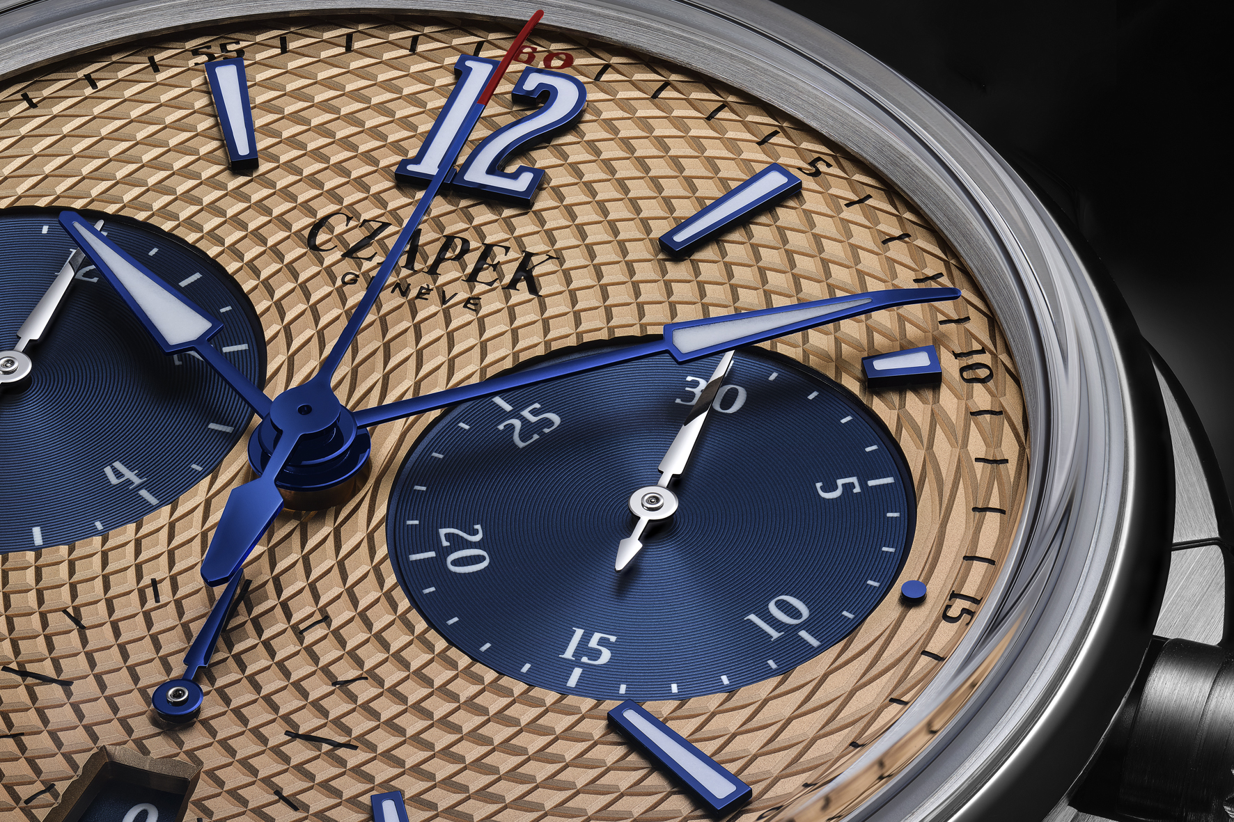 Il Faubourg de Cracovie salmone e blu presenta un quadrante guilloché inciso a mano dagli artigiani di Metalem, partner di Czapek a Le Locle. Lo speciale motivo, chiamato “Résonance”, deriva dal motivo “Ricochet” della collezione Quai des Bergues: cerchi concentrici originati dai due contatori a ore 3 e 9 si intersecano e formano quadrati in basso rilievo. Il quadrante e i contatori, marchio di fabbrica di Czapek, sono realizzati nella “Lega 401”, una combinazione di oro al 55% completata da una miscela di platino, palladio e argento. La finitura salmone, con le sue tonalità dorate, è galvanica. Il colore è unico e conferisce un tocco speciale all’incisione e alle “ombre” ai bordi del motivo guilloché realizzato a mano. La cassa in acciaio di 41,5 mm ricorda la caratteristica cassa “Revolution” della collezione Quai des Bergues, dove i proteggi-corona fungono da pulsanti per le funzioni cronografiche.
