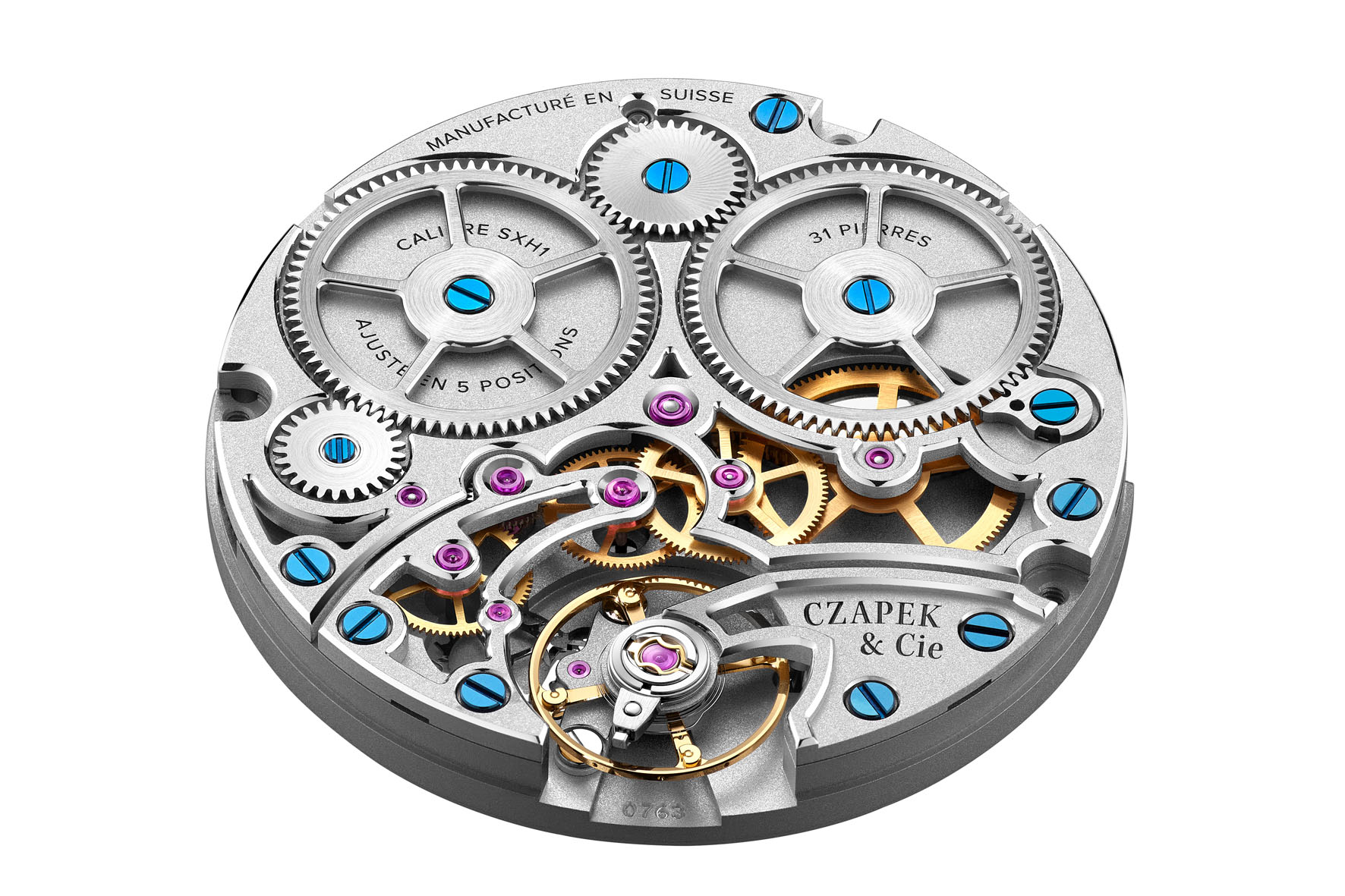 L’idea di ripensare esteticamente il movimento è nata dagli appassionati del marchio, come spesso accade con Czapek. Il calibro SXH1 originale del Quai des Bergues è stato realizzato nello spirito dei tradizionali artigiani ginevrini noti come “cabinotiers”. Un calibro tutto tecnicità e sobrietà. “Quando abbiamo realizzato l’Antarctique, con i suoi ponti come pizzo, e la sua architettura complessa, il pubblico è rimasto stupito”, afferma de Roquemaurel. “Ci siamo quindi resi conto che dovevamo armonizzare tutti i nostri movimenti seguendo questo modello”.