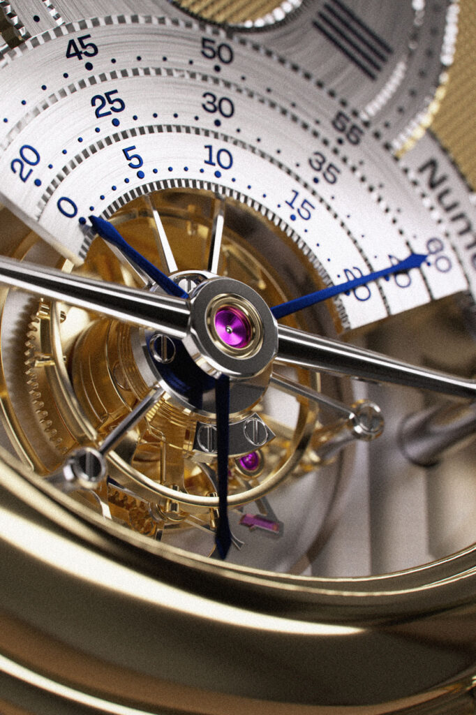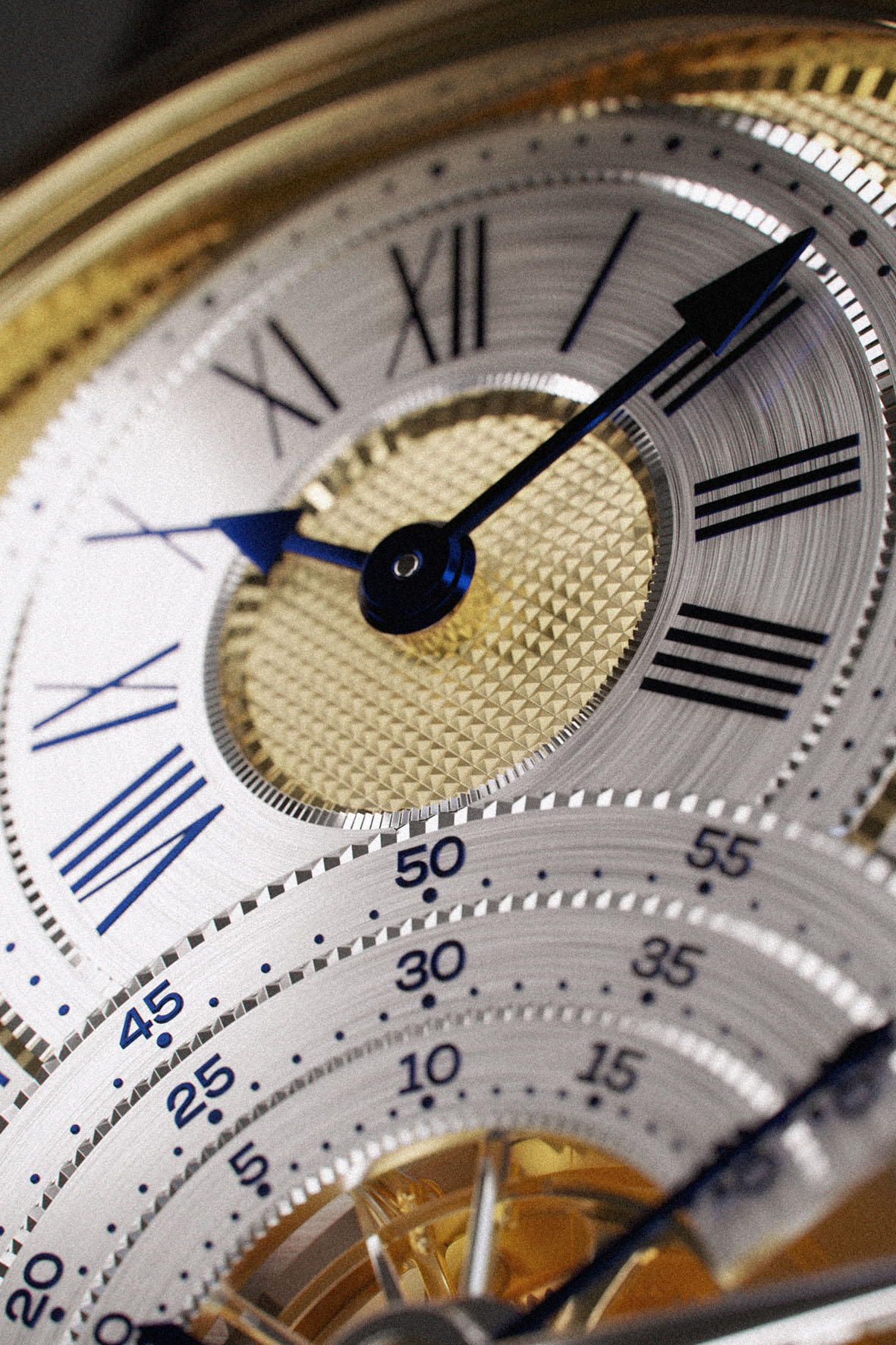 Il quadrante è frutto della collaborazione con uno dei più grandi orologiai viventi, il maestro di origini finlandesi Kari Voutilainen. Nello specifico, la base del quadrante inizialmente ricavata da un disco d’oro giallo massiccio 3N, è decorata con la tecnica del Guillochage a motivi Clous de Paris. In corrispondenza invece degli indicatori di ore, minuti e secondi è utilizzata la finitura Circular Grained. Più in basso, ad altezza dell’apertura ad ore 6 è visibile sia la platina accuratamente decorata con Côtes de Genève, che la base del tourbillon con finitura spazzolata frosted. Un ulteriore dettaglio meritevole di attenzione riguarda la tipografia, la quale è stata leggermente semplificata, nel passaggio a font sans serif, per conferire un appeal più contemporaneo all’orologio.