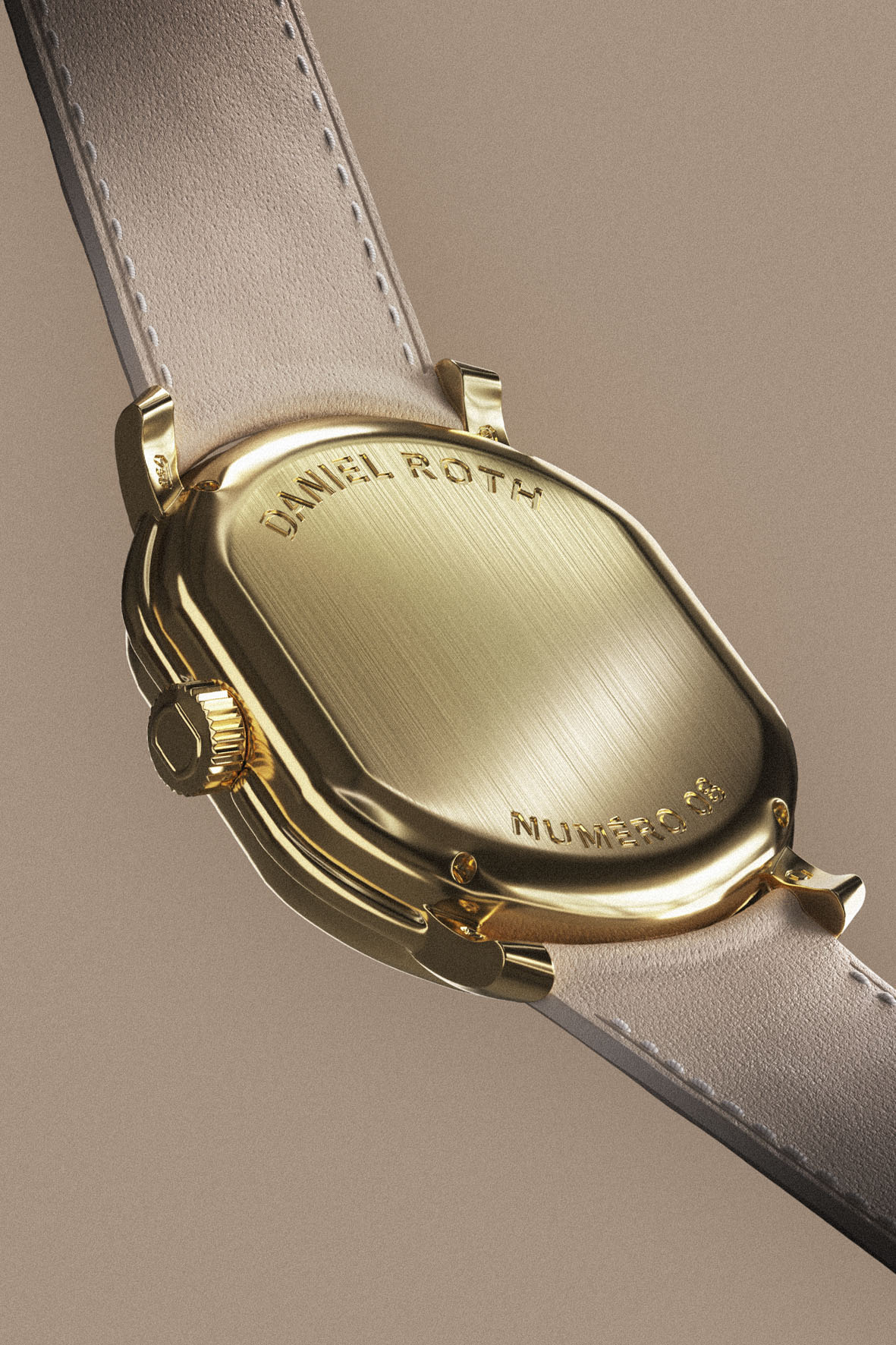 La cassa da 35,5 x 38,6mm, realizzata in oro giallo, conserva l’iconica forma a doppia ellisse e lunetta scalettata tipica degli orologi di Roth. Le anse sono ancora saldate a mano alla carrure ma vengono rimodellate a favore di un profilo più ergonomico ed elegante. La resa estetica del Tourbillon Souscription è ulteriormente enfatizzata dal fondello chiuso, mostrante il nome del brand e la numerazione dell’esemplare, e dall’unico quadrante frontale. Queste scelte hanno permesso al team de La Fabrique du Temps Louis Vuitton di ottenere un’altezza complessiva della cassa di 9,6 mm (dimensione più contenuta rispetto all’originale di 11mm).