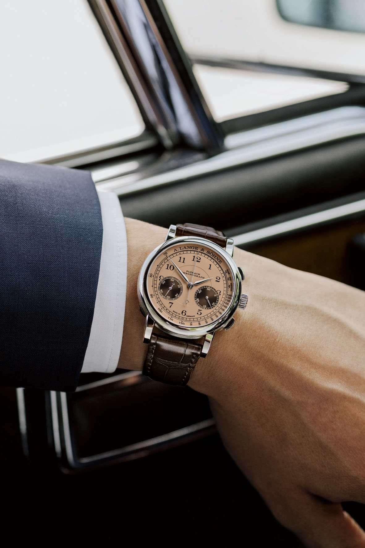 The 1815 CHRONOGRAPH in the 39.5 mm white-gold case melds classic design with mechanical ingenuity. With its Arabic numerals and the railway-track minute scale, the dial in pink gold recalls A. Lange & Söhne’s legendary pocket watches. The brown subsidiary dials for the seconds and the minute counter contrast well against the bright background. The black rhodiumed gold hands for the hours and minutes, that match the case, and the steel chronograph hand, the subsidiary seconds hand and the minute-counter hand, which are also rhodiumed, ensure good legibility as well. A dark-brown strap made of hand-stitched leather with a prong buckle in white gold rounds out the colour concept.