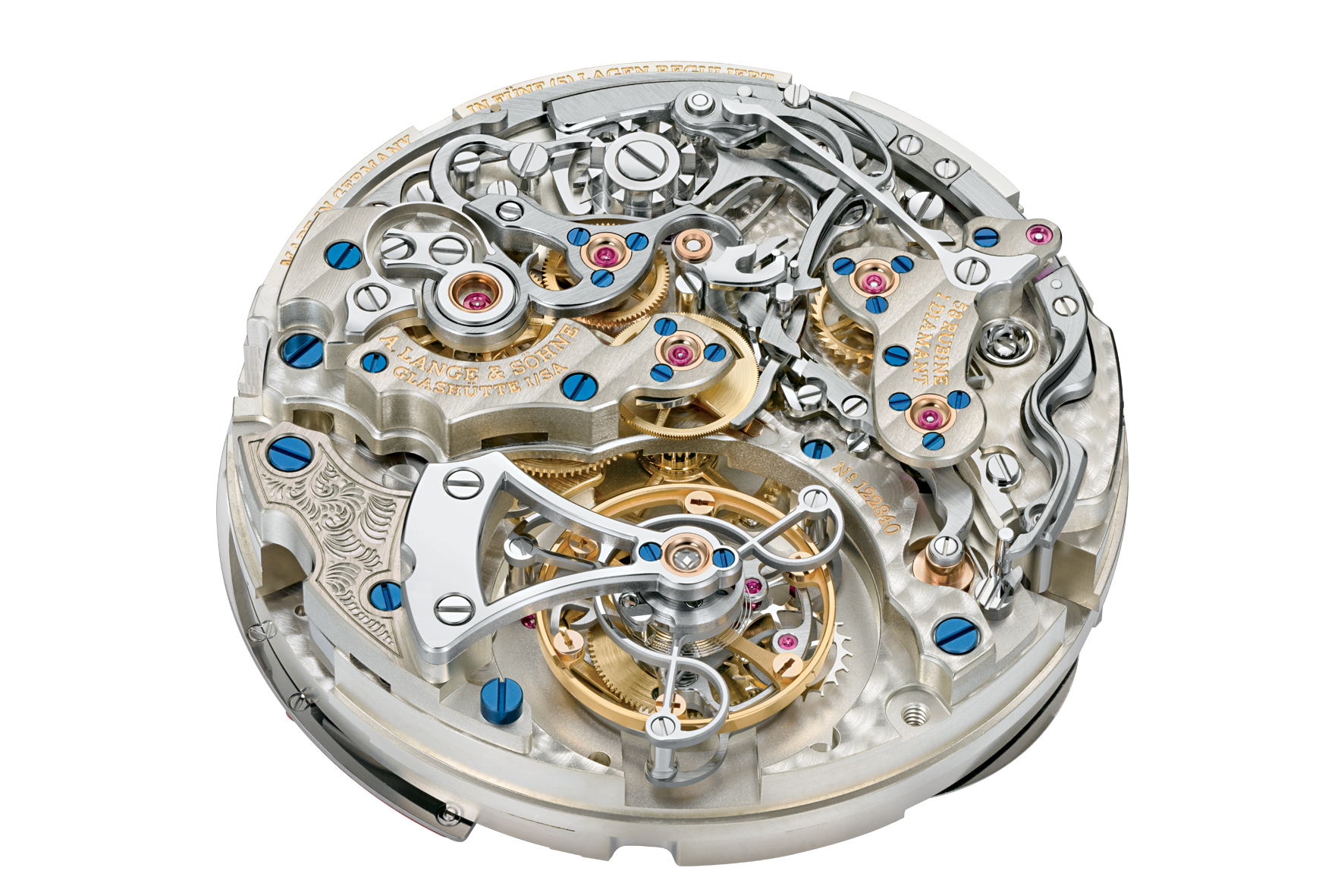 The development of the Datograph Perpetual Tourbillon is powered by an impressive success story that began with the presentation of the first Datograph in 1999. Its rare combination of a classic column-wheel design, a precisely jumping minute counter and the flyback function attracted considerable attention. The clearly structured dial layout, in which the Lange outsize date and the two subsidiary dials form an equilateral triangle, gave it the status of a timeless icon. This prominent constellation is echoed by the Datograph Perpetual Tourbillon. Its larger diameter made it possible to enlarge the subsidiary dials that accommodate the displays of the perpetual calendar. The subsidiary seconds, the day of the week and the day/night indicator are on the left side, while the precisely jumping minute counter, the months, and the leap-year indicator are on the right.