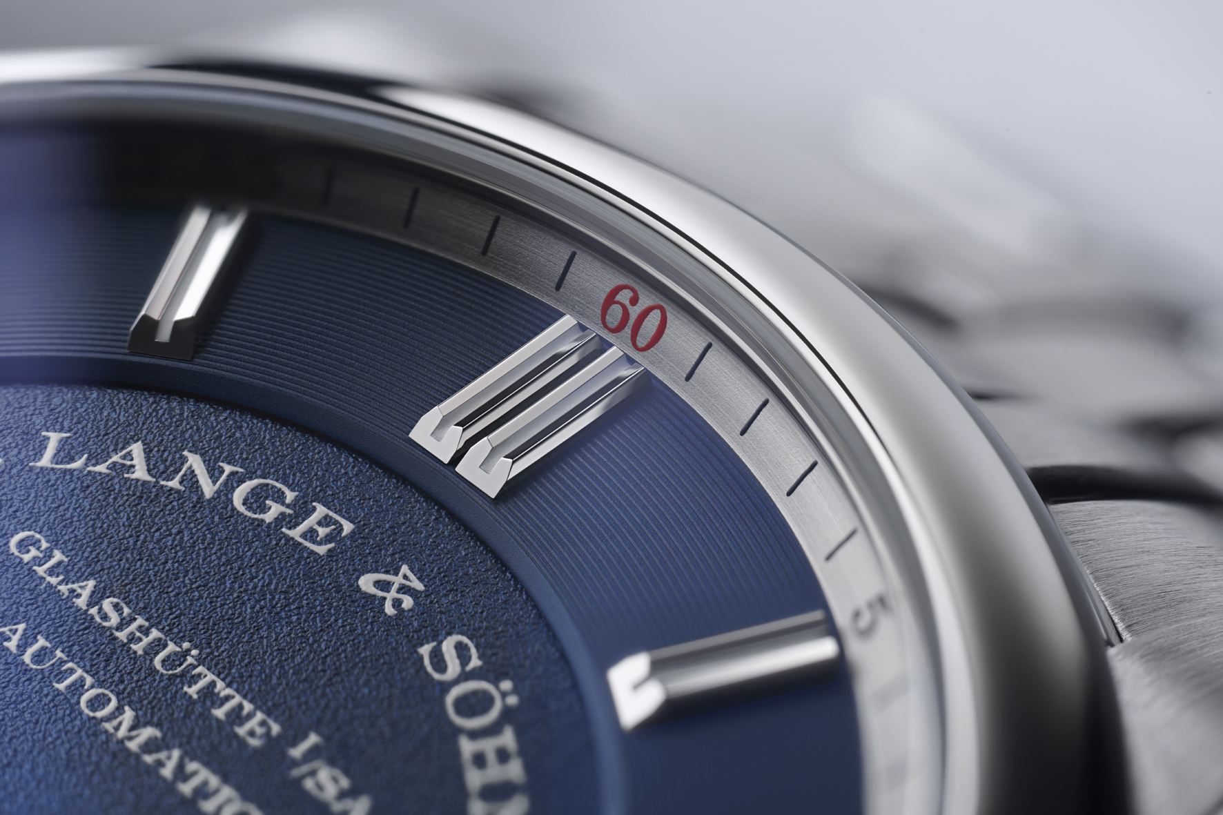 The dial is made of brass and has several levels with different surfaces. Just like the outer scale of the subsidiary seconds dial, the notched baton appliques made of white gold lie above concentric lines, a technique called azurage. They contrast against the grained inner surfaces of the main and subsidiary dial. A bevelled, argenté coloured flange ring with a printed minute scale frames the dial. The number 60, printed in red at 12 o’clock, provides a colourful accent. In the ODYSSEUS, the brand-typical lancet-shaped hands for hours and minutes are luminous like the inner surfaces of the baton appliques.