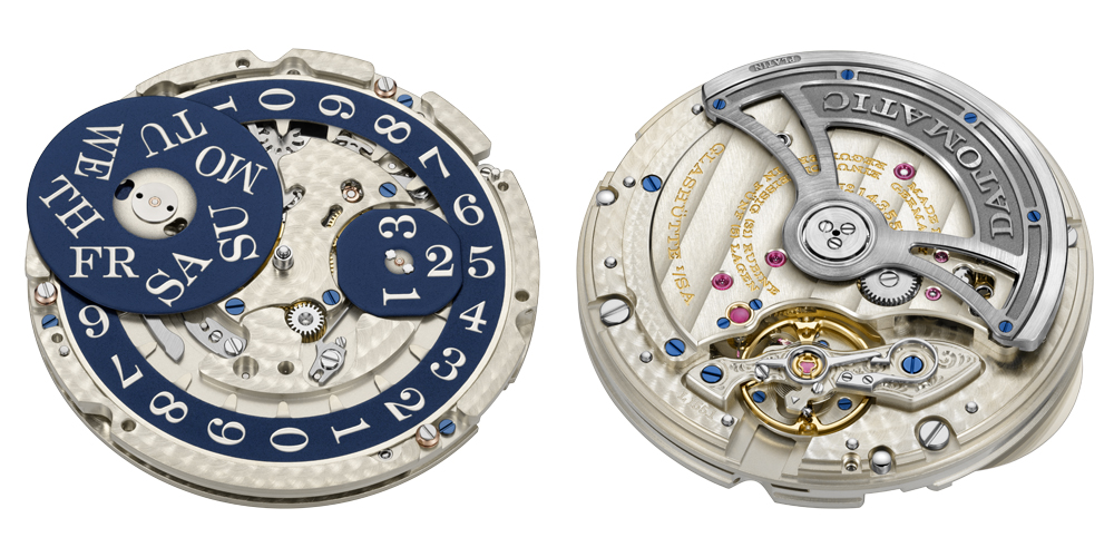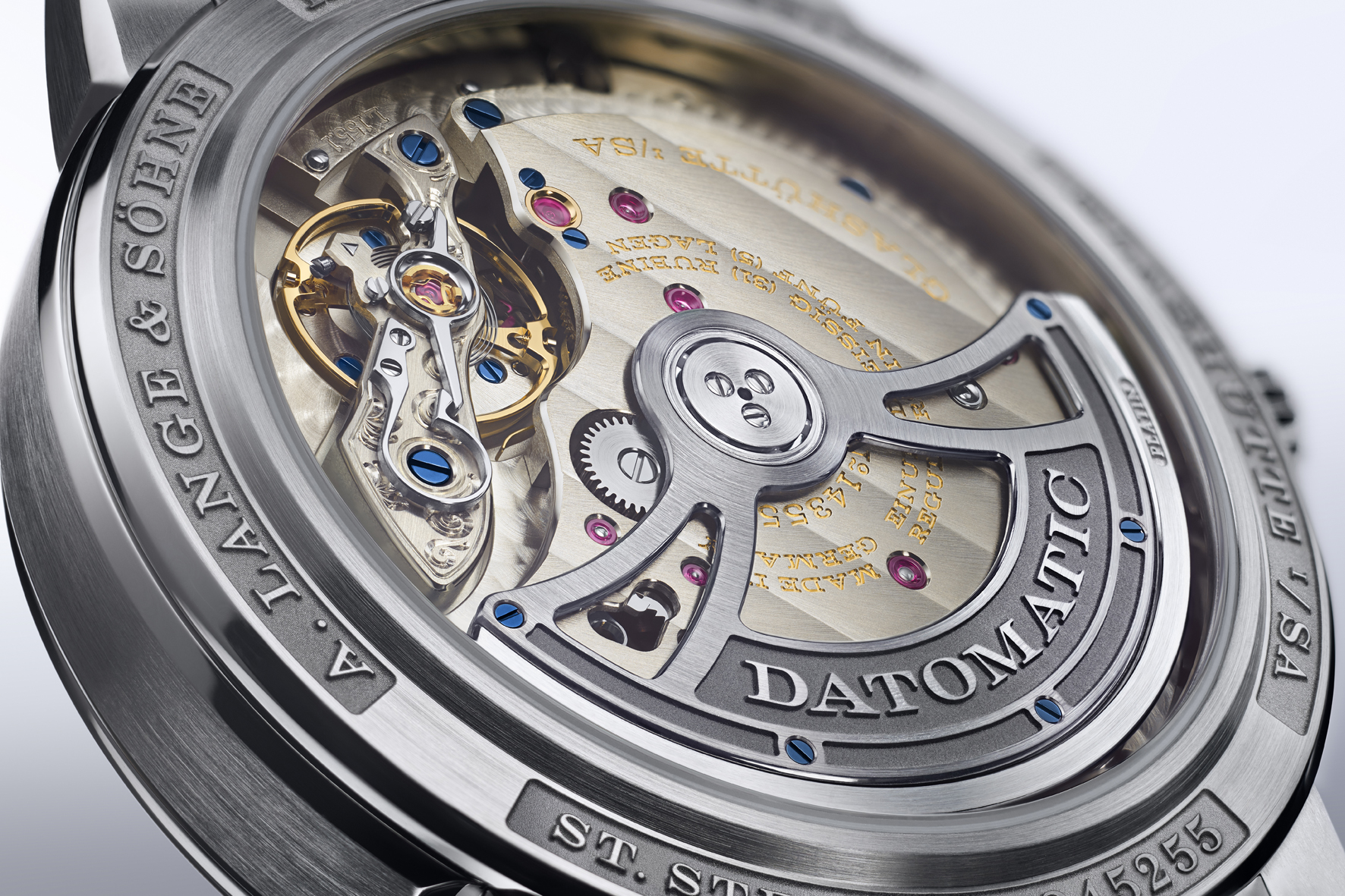 The oscillation system of the ODYSSEUS is held by a balance wheel bridge secured at two points. It is manually engraved with a wave motif. Other movement decorations also express the concept of combining traditional facets with new ones. All frame parts of the calibre L155.1 DATOMATIC are made of German silver. Additionally, elements of the rotor were black-rhodiumed. In accordance with the A. Lange & Söhne philosophy, the entire movement is elaborately finished by hand and assembled twice. A further typical Lange hallmark, a screwed gold chaton secures the upper bearing jewel of the escape-wheel arbor. (Price €.28.700)