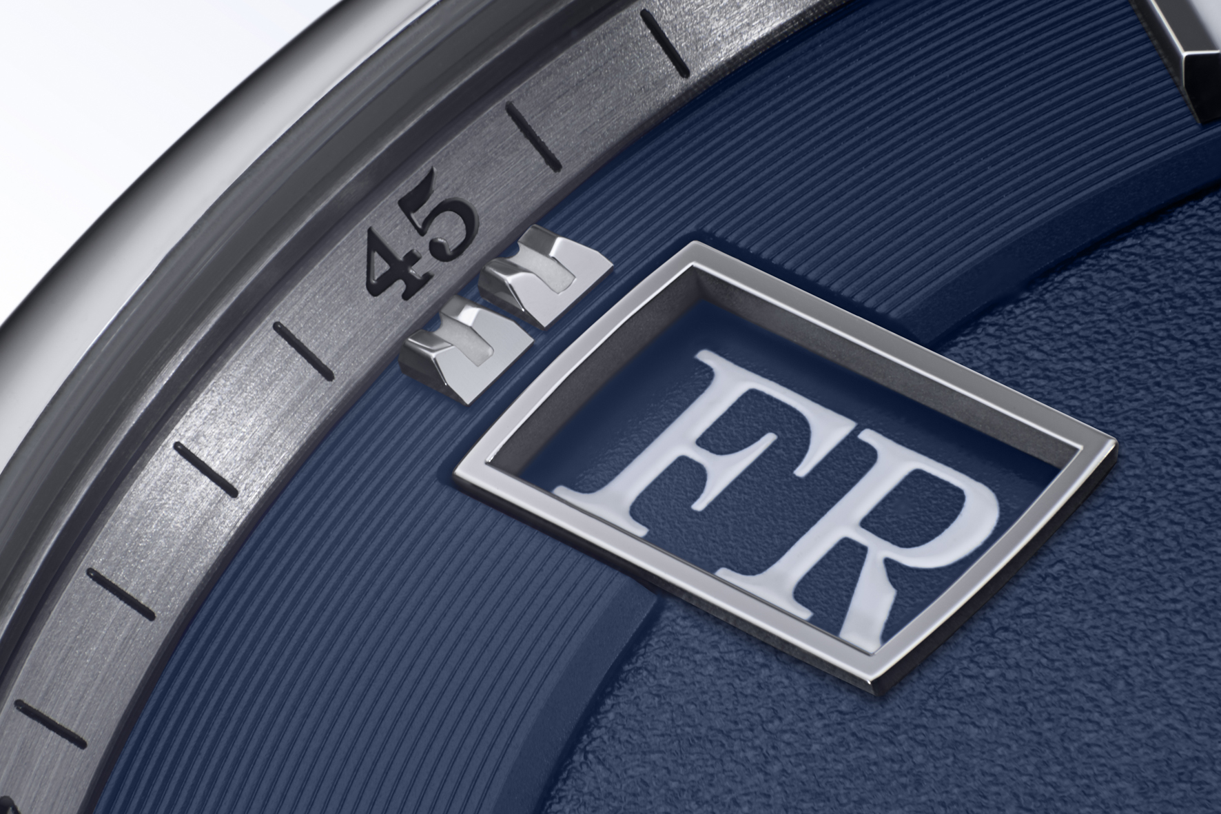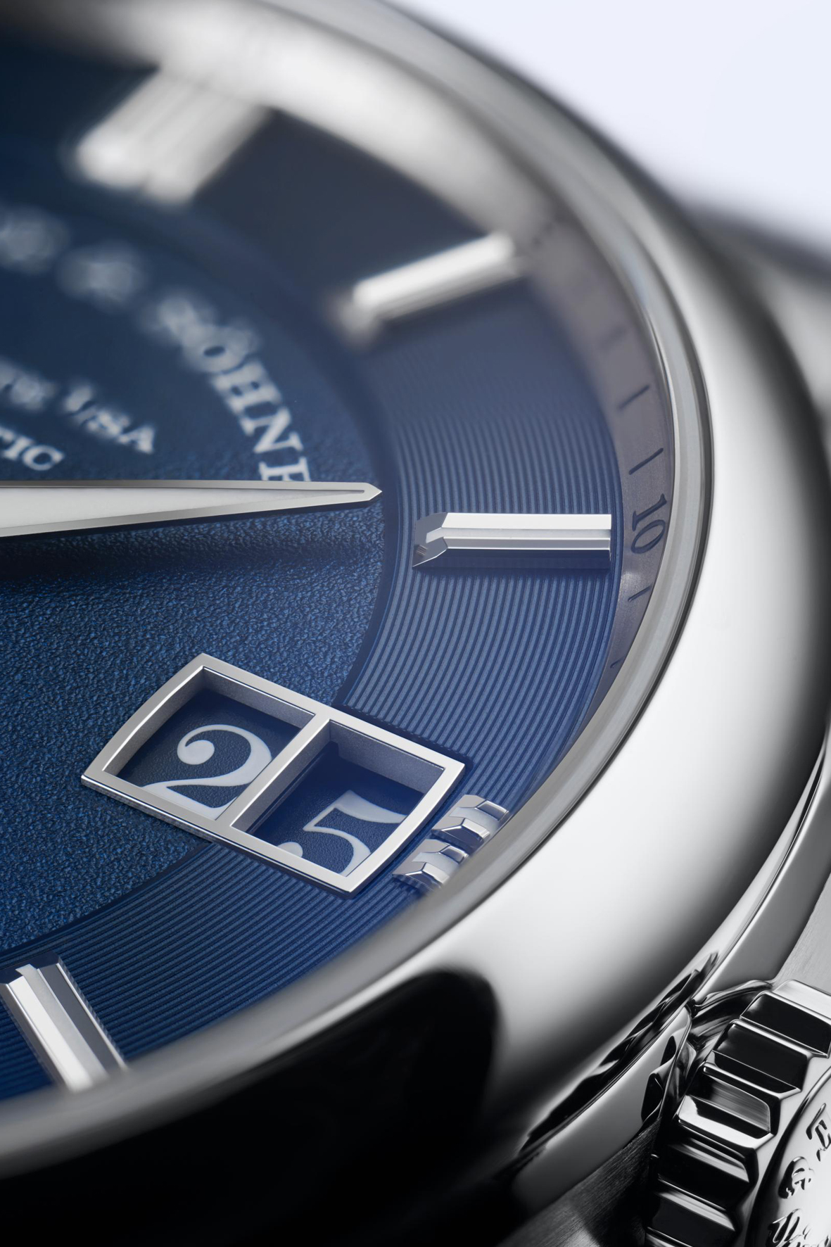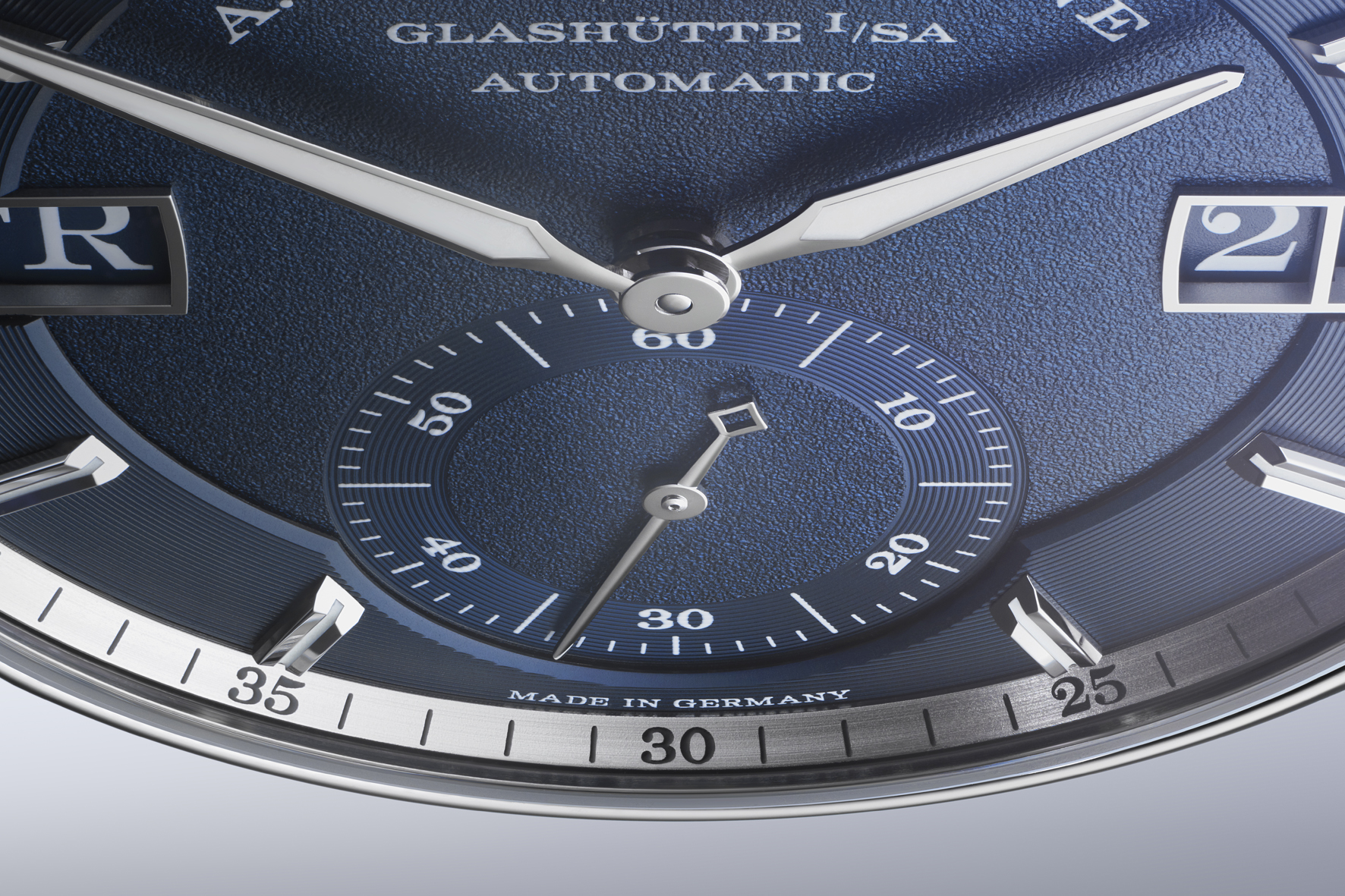 What first meets the eye on the dark-blue dial is the day-of-week and date display. Located on the right, the Lange outsize date in the classic double aperture is complemented with an equally large day- of-week display on the left. The outer verticals of the frames echo the curvature of the bezel. The typical Lange font is used for both displays, though here, the numerals and letters are white against a blue background.