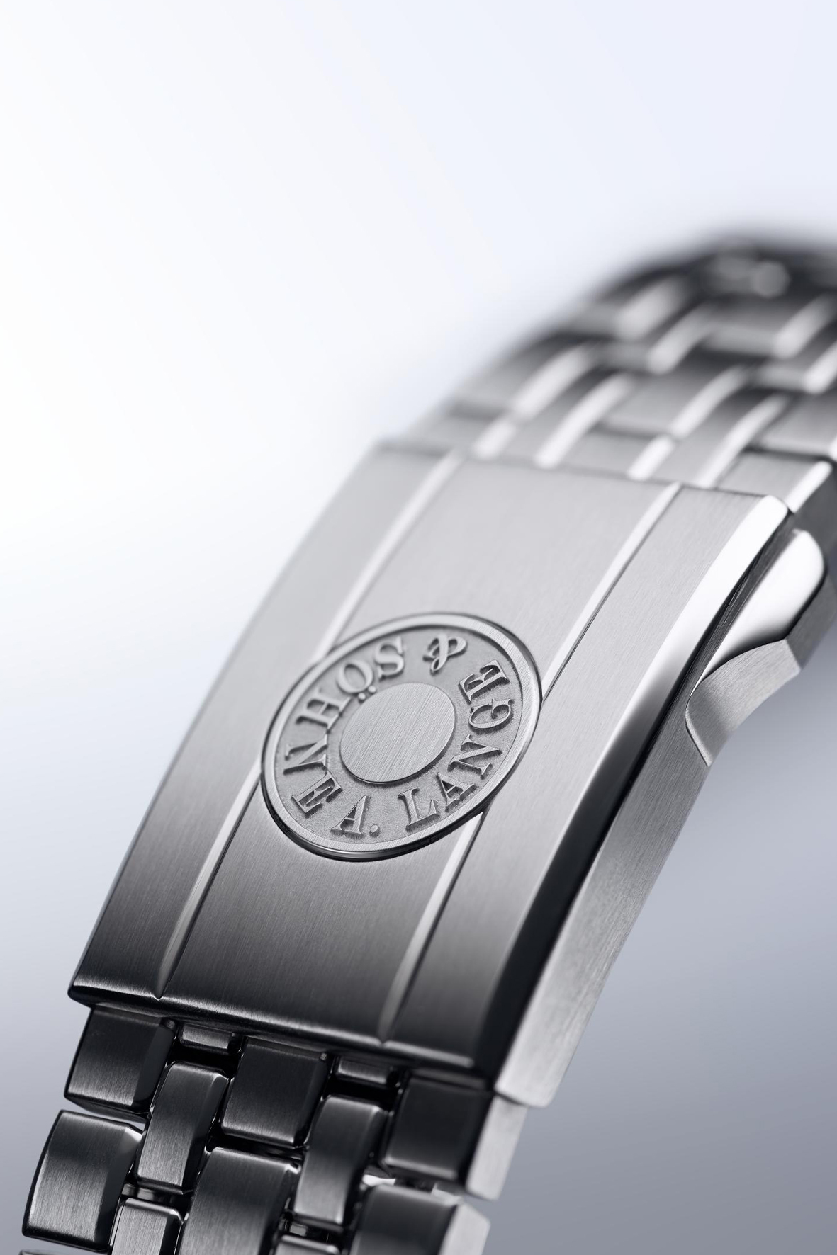 The steel bracelet is eminently comfortable to wear. Its length can be adjusted in small steps up to 7 millimetres thanks to a safety deployant buckle. By pressing the pusher embossed with the Lange signature the bracelet can be pulled or pushed to adjust the desired length. It is not necessary to open the buckle. If required, the bracelet can also be extended by adding further links.
