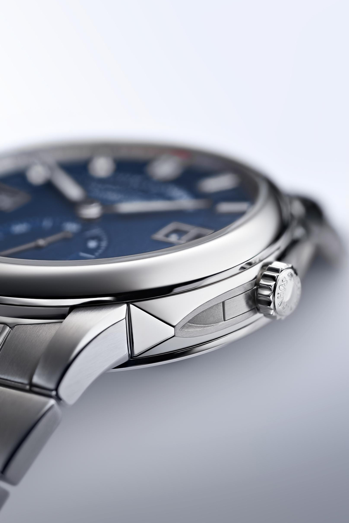 The ODYSSEUS is the first Lange sporty watch with a water-resistant case and a screw-down crown, exposed to a test pressure of 12o metres. The design of the steel case with a diameter of 40.5 mm and a height of 11.1 mm, featuring an integrated steel bracelet, embraces traditional brand elements and reinterprets them. This applies particularly to the sculpted, slightly cantilevered middle band of the three-part case. Its surfaces are decorated with a satin contour finish and the edges are emphasised with a chamfer. The combination of brushed surfaces and chamfered edges is echoed on the lugs and links of the massive steel bracelet. Specially sealed, tapered buttons for correcting the date and the day of week are arranged at 2 and 4 o’clock.