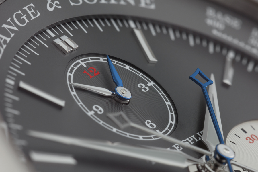 The Triple Split is endowed with a flyback function that involves all three hand pairs as well. Thus, the chronograph can be reset and instantly restarted by pressing the lower chronograph pusher even during an ongoing measurement. A power-reserve indicator based on Lange’s typical UP/DOWN display shows how much of the 55 hour reserve remains available. The well-organized grey dial in solid silver is combined with the 43.2mm 18-carat white-gold case. The three rattrapante hands in blued steel clearly set themselves apart from the rhodiumed chronograph hands. The hands that display the time and the applied baton hour markers are made of rhodiumed gold.