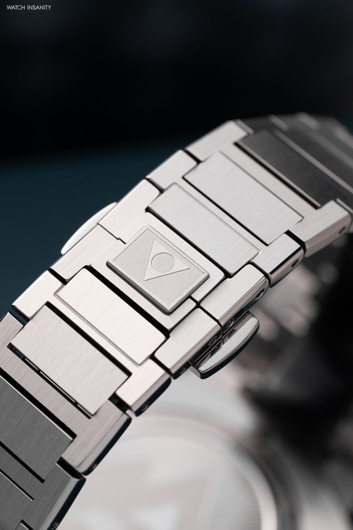 Last but not least, we must mention the integrated bracelet, also made of titanium and very attractive. Like the case, it features an angular, tool watch design, with alternating H-shaped links and rectangular central links. Its aesthetics are only partially softened by the horizontal satin finish, which matches the mirror polish of the inner sides. Overall, its flexibility and reduced thickness make it comfortable to wear. The only drawback is the lack of micro-adjustment due to the butterfly clasp.
