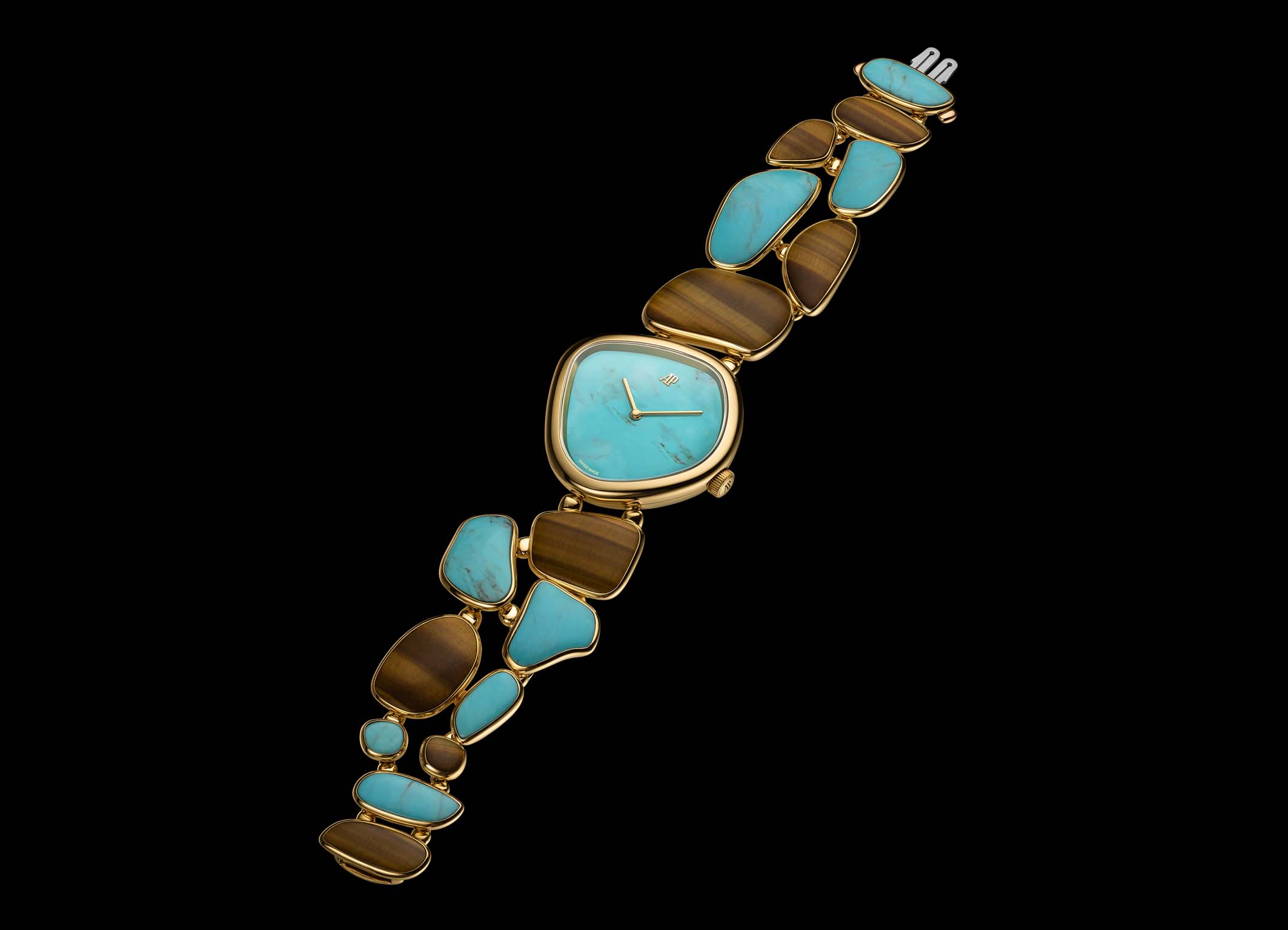 The outer dial of the Établisseurs Nomade is crafted from natural stone and set within a case composed of a bevelled metal mesh and faceted stones, all hand-finished. As with the Établisseurs Galets, Audemars Piguet has involved over fifteen people in the creation of this watch and plans to release five versions featuring different combinations of stones by 2026.