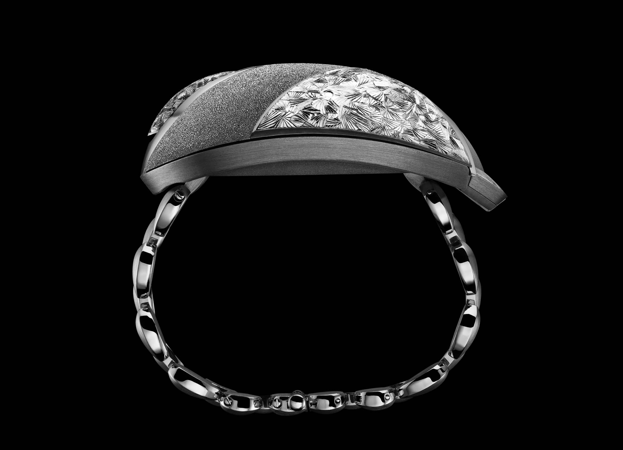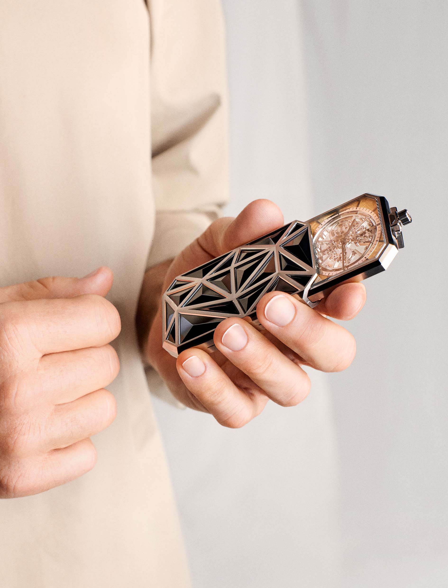 It consists of an irregularly shaped pebble, whose sinuous contours led designers and engineers to specifically shape the Calibre 3098 to mirror that of the case and, consequently, of the pebble itself. The Calibre 3098 is a hand-wound manufacture movement that controls the hours and minutes, indicated by two small yellow gold hands. It is based on the Calibre 3090, which operates at 21,600 vibrations per hour and offers a 48-hour power reserve. Assembled, regulated and fitted into the case by a single watchmaker, it draws on the principles of watches crafted by the établisseurs.