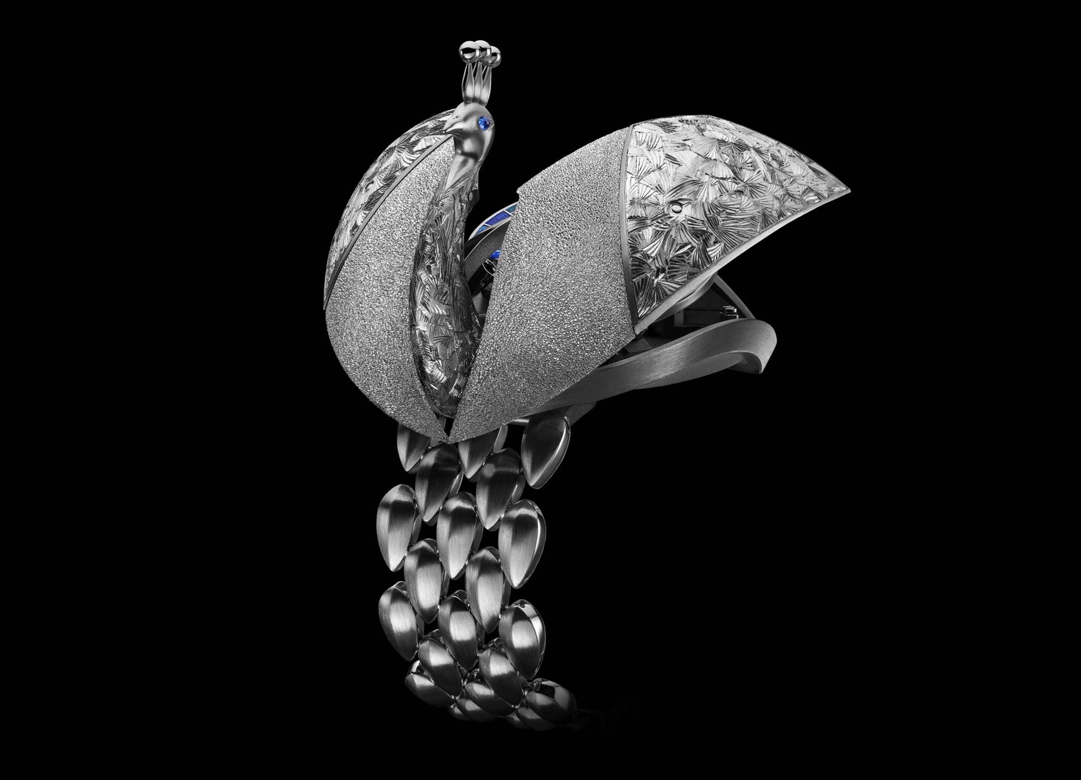 In designing it, the Maison’s creative team drew inspiration from the animal kingdom. When closed, the watch resembles a beetle, which the craftsmen have crafted from finely engraved white gold. When a specific spot is pressed, the beetle’s wings and head open to reveal a miniature, hand-crafted peacock. Between its wings, a finely hand-engraved translucent enamel dial is visible, representing the tail.