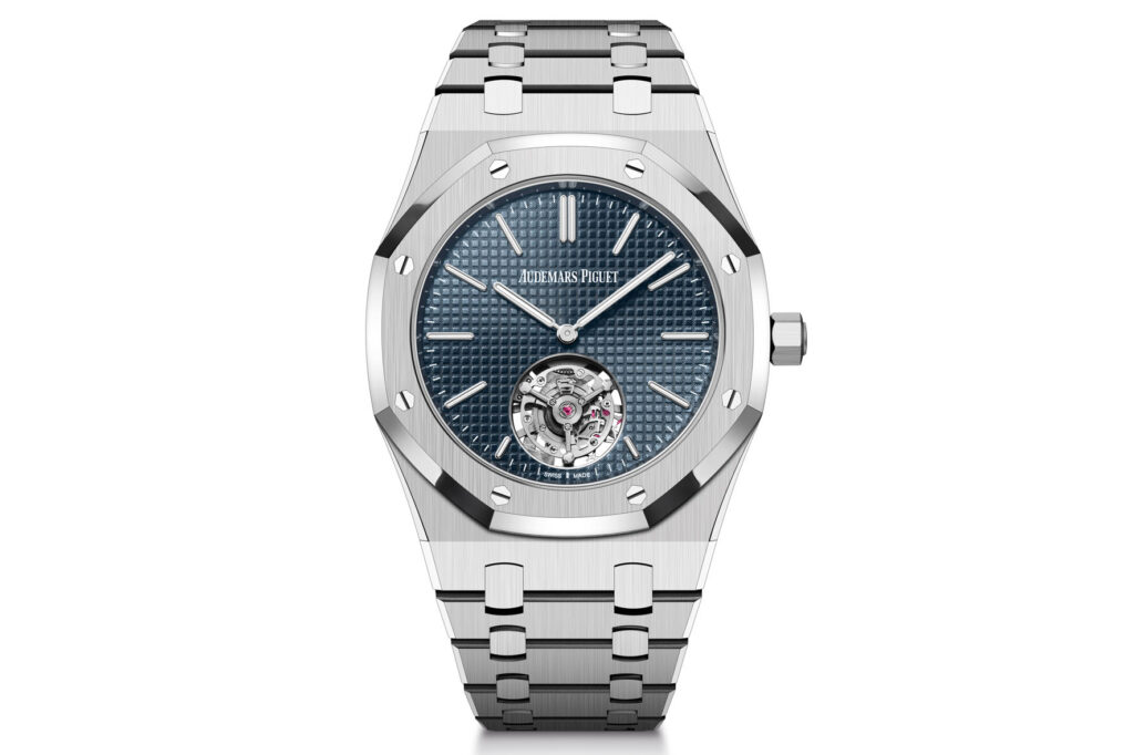 Manufactured in steel with a 39mm diameter by 8.1mm thick case, the new Royal Oak Selfwinding Flying Tourbillon Extra-Thin represents the first “Jumbo” in history to be equipped with a selfwinding flying tourbillon and introduces the new Caliber 2968, which measures just 3,4 mm thick. But that’s not all, the new Royal Oak Selfwinding Flying Tourbillon Extra-Thin will soon be joined by a second 37mm version featuring a different colored dial due out next September.