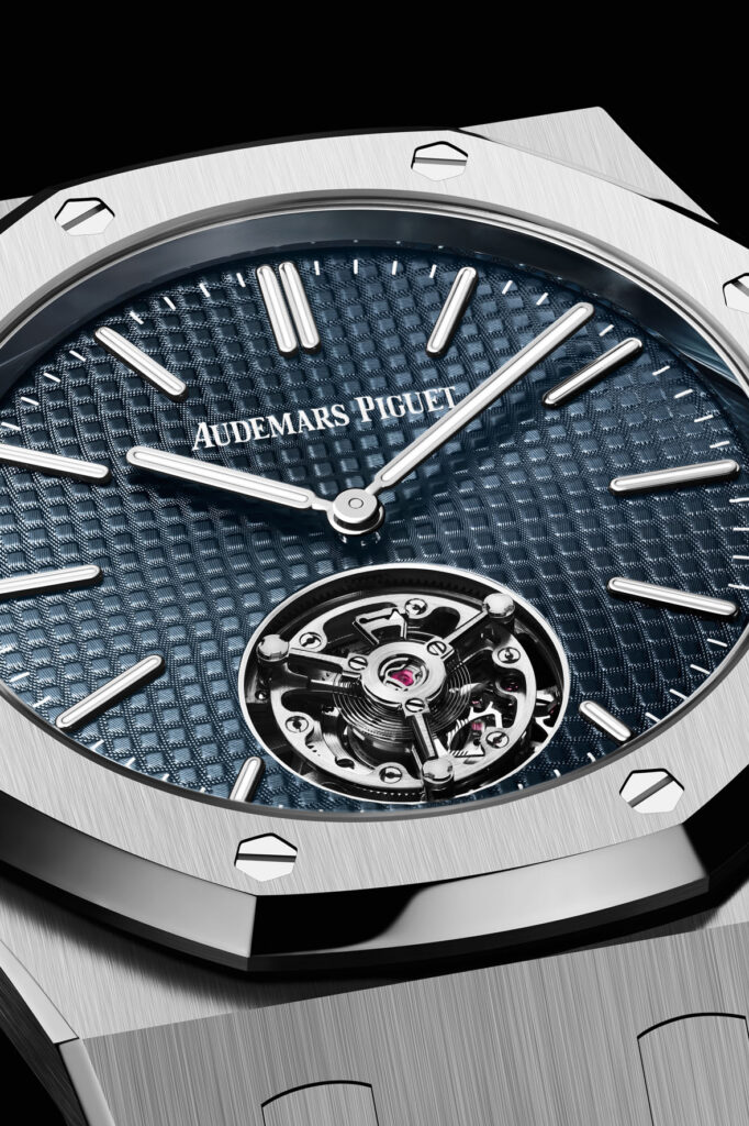 Just as on the 1972 model, this new “Jumbo” reference is distinguished by bathtub-shaped hour- markers and hands filled with luminescent material to ensure optimal readability in the dark. The Audemars Piguet signature, like the minute track, is printed in white on the Tapisserie motif. The titanium flying tourbillon cage rotating at 6 o’clock stands out against the blue Tapisserie backdrop to create an airy effect.