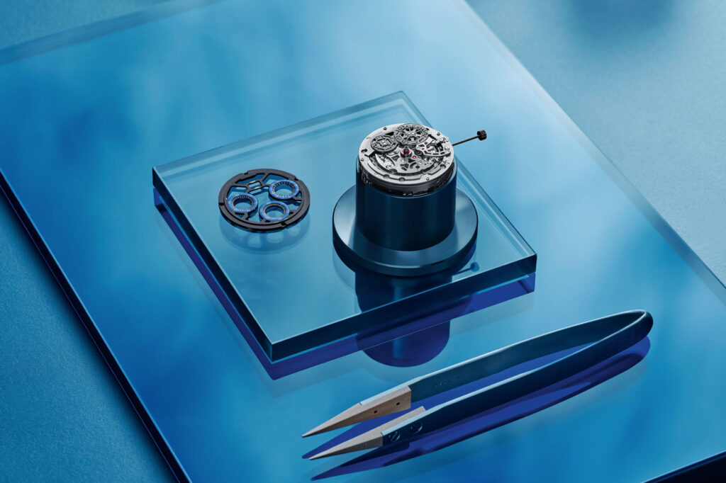 Conceived like the bridge of a movement, the openworked dial is the result of very precise machining. Circular apertures have been cut into a single sandblasted nickel silver plate, finished with black PVD and decorated with diamond-polished rhodium-toned bevels, to reveal part of the micro-mechanics ticking within. The two-tone design adds depth and play of light to this edgy timepiece, which is further emphasised by the absence of a logo on the dial. In keeping with the blue highlights of the case middle, the inner bezel and the external zones of the three counters are finished in an electric blue hue, which contrasts with the grey and black tones of the movement while enhancing legibility.