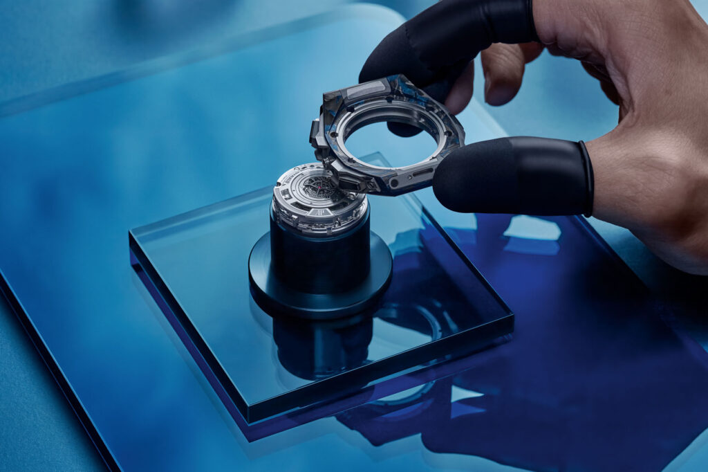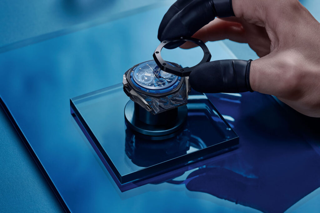 The ultra-light CFT carbon case middle, adorned with blue glow-in-the-dark fibres to enhance the watch’s playful aesthetic, is complemented by a black ceramic bezel decorated with satin-brushing and polishing. These meticulous finishes are also visible on the black ceramic crown, caseback and push-pieces. The case and crown are slightly curved to follow the natural shape of the wrist. The push-piece guards at 2, 4 and 9 o’clock are contrastingly honed in titanium in an echo to some of the lighter components of the openworked dial.