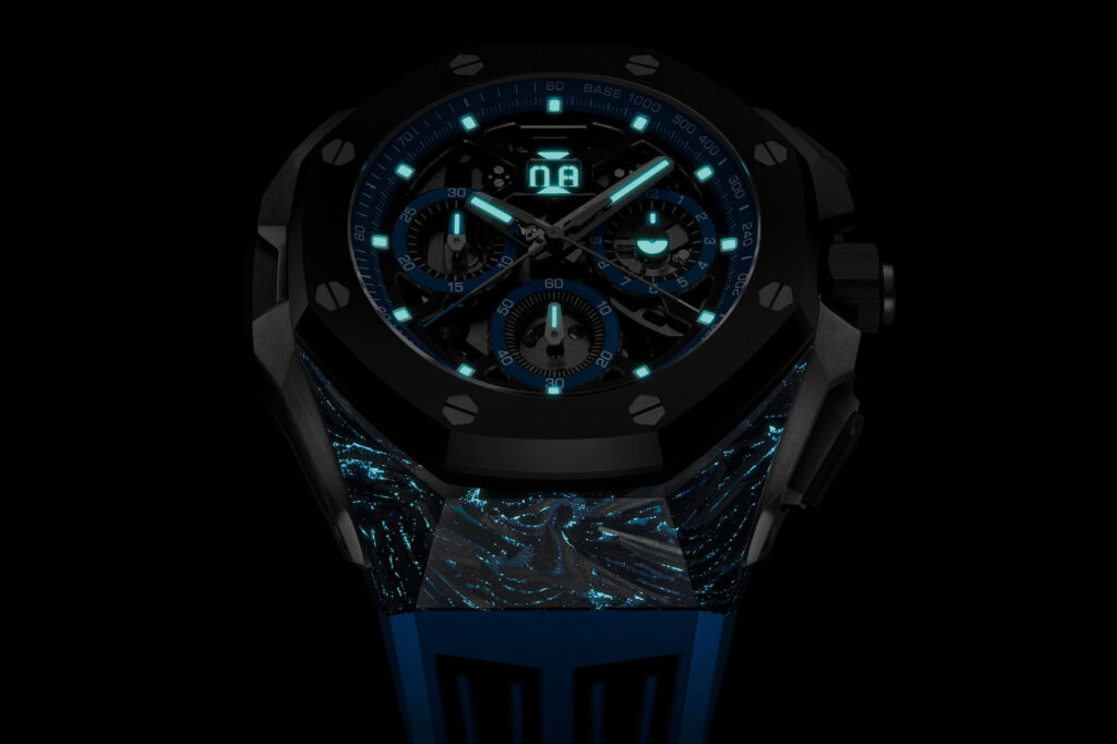 Unlike previous generations of carbon, Audemars Piguet’s Chroma Forged Technology (CFT) makes it possible to colour the carbon fibres directly instead of the resin and arrange them as desired in the component produced, opening up new creative possibilities. Its lower resin content compared to traditional forged carbon makes it less susceptible to scratches.