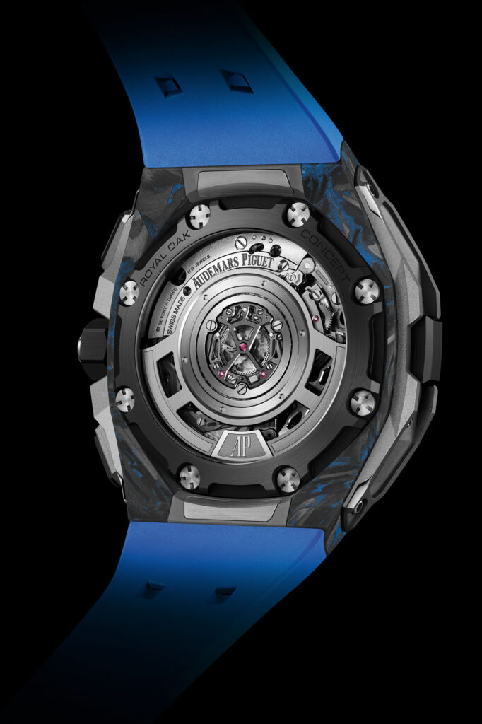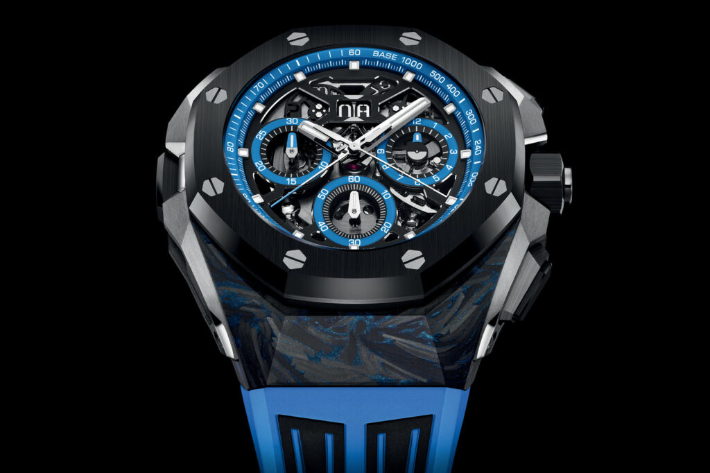 The timepiece is mounted on a blue rubber strap with black accents for a sporty touch. Fitted with the interchangeability system introduced in the 43 mm Royal Oak Concept collection in 2023, the watch also comes with a second black and blue rubber strap.