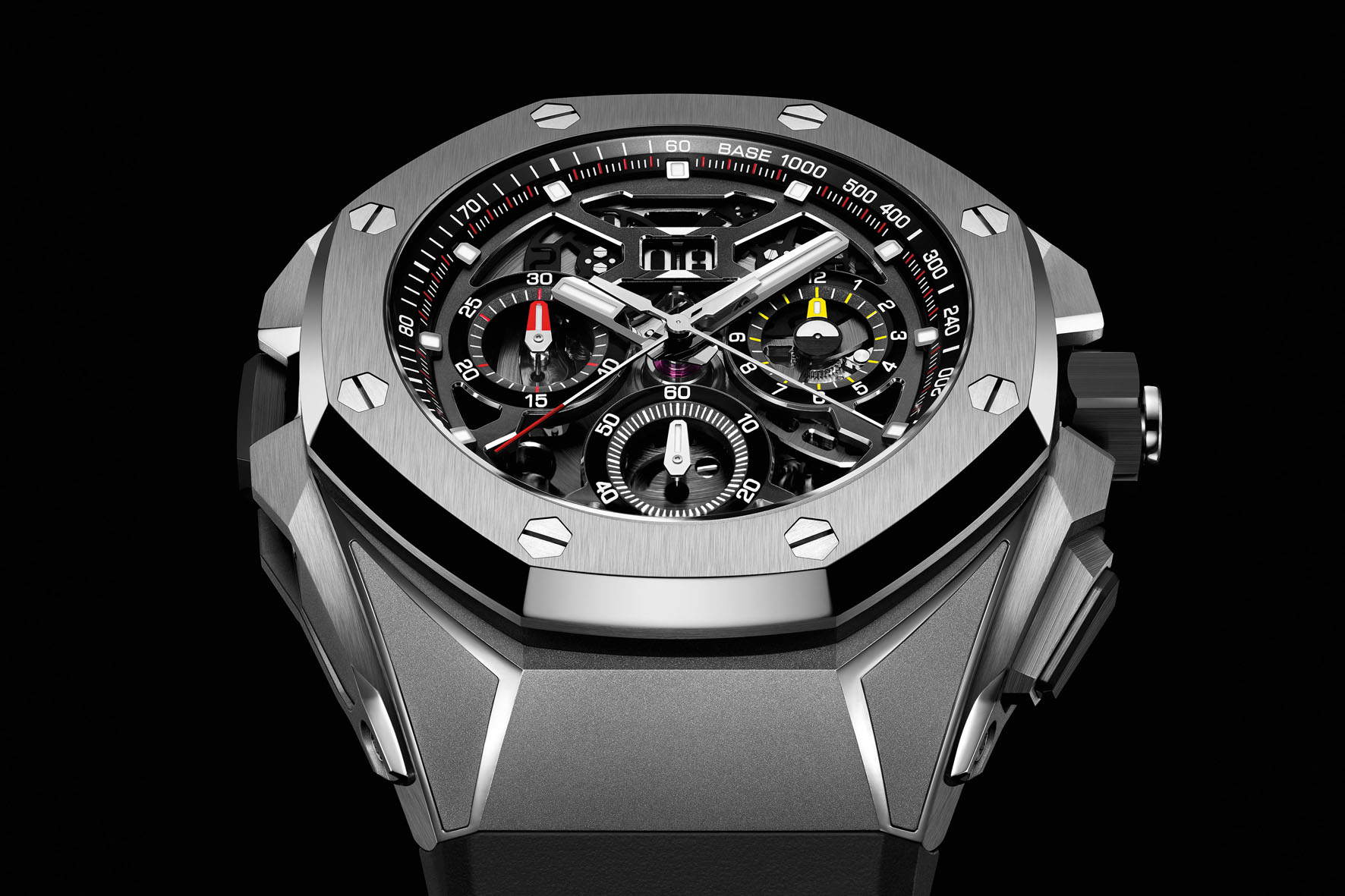 Audemars Piguet opens a new chapter for the Royal Oak Concept with the release of its very first selfwinding split-seconds flyback chronograph. Inspired by the collection’s high-tech identity, this timepiece takes the Royal Oak Concept’s futuristic looks, ergonomics and skilled performance to a new level. In addition to introducing both a new 43 mm case size and the first interchangeable strap of the collection, the sporty timepiece boasts a highly contemporary, three-dimensional titanium case playing with textures, depth and light. It is powered by a new cutting-edge movement, the selfwinding Calibre 4407, whose complicated micro-mechanics takes centre stage on the rear side. For the first time, the caseback showcases the advanced split-seconds mechanism which has been inserted within the ball bearing holding the oscillating weight. More than 20 years after the release of the first Royal Oak Concept, the collection continues to offer a pioneering platform of R&D experimentation.