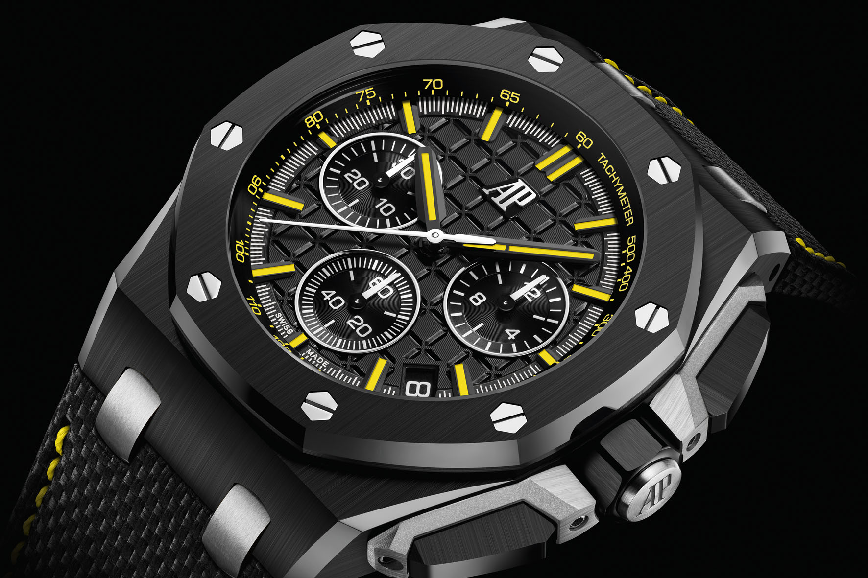 Limited to 500 pieces, the new Royal Oak Offshore Selfwinding Chronograph comes with a black calfskin strap featuring a textile effect and yellow stitching. Thanks to the watch’s integrated interchangeable system, the owner can easily change his or her strap for a yellow calfskin version with black stitching.