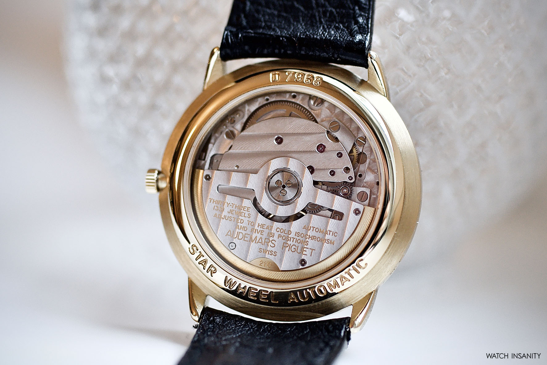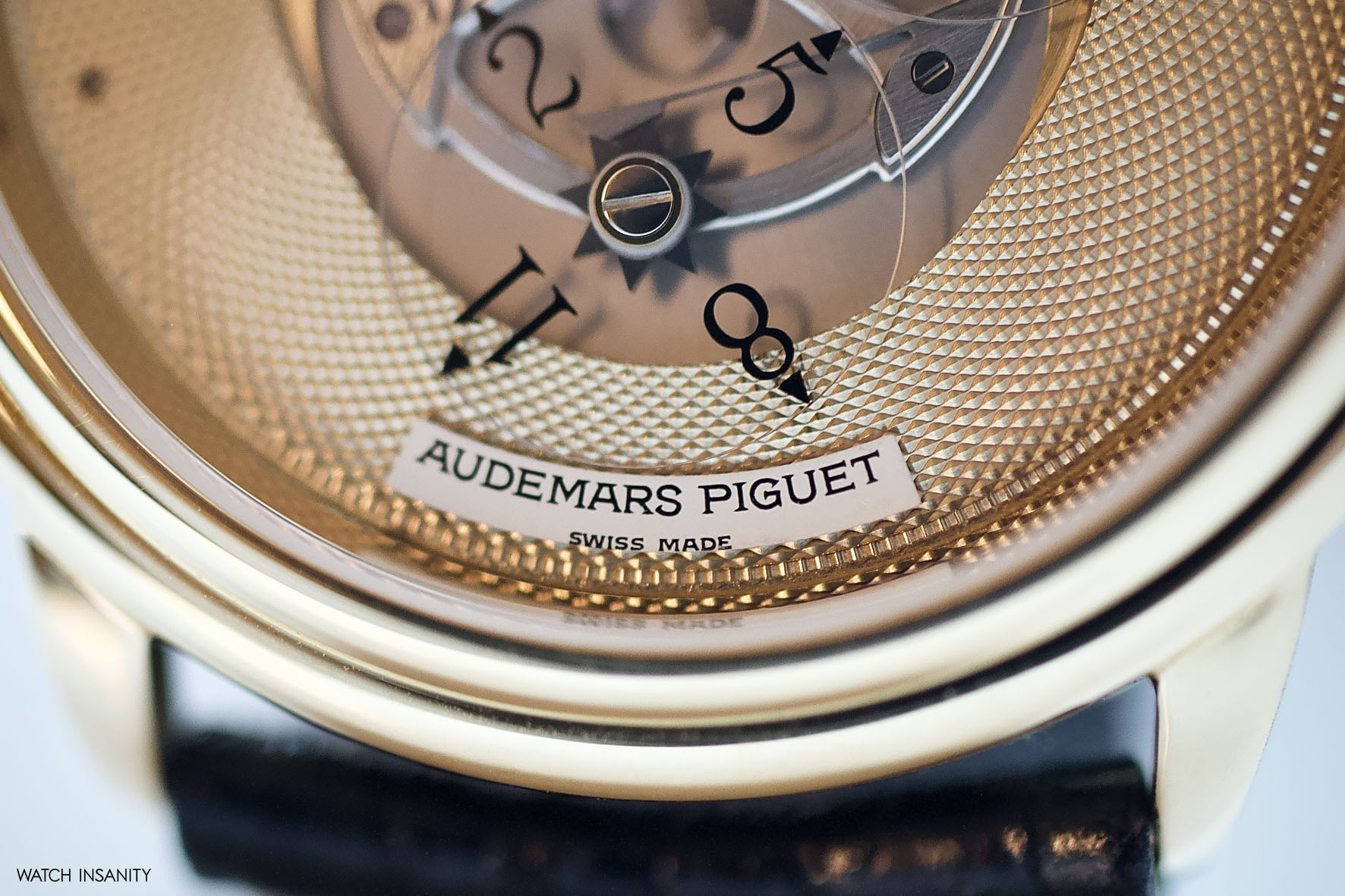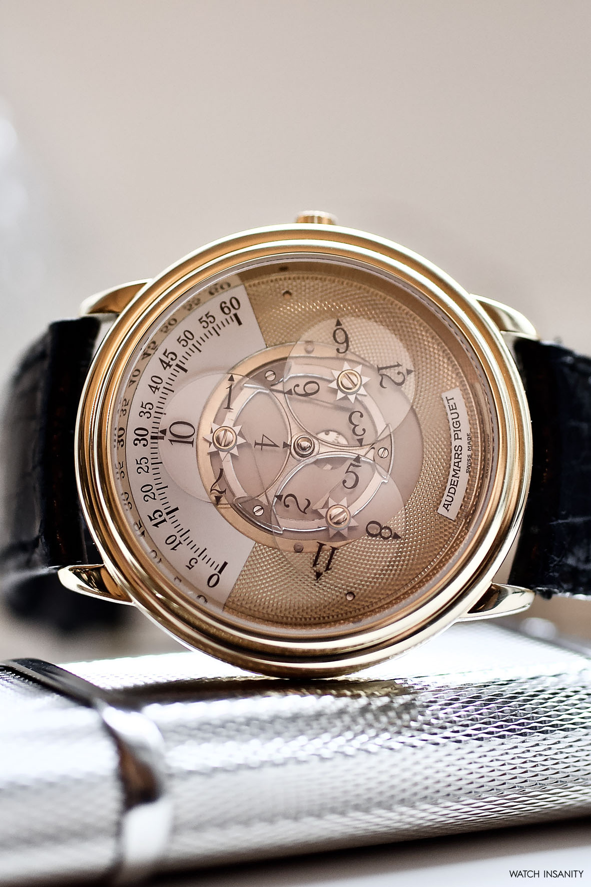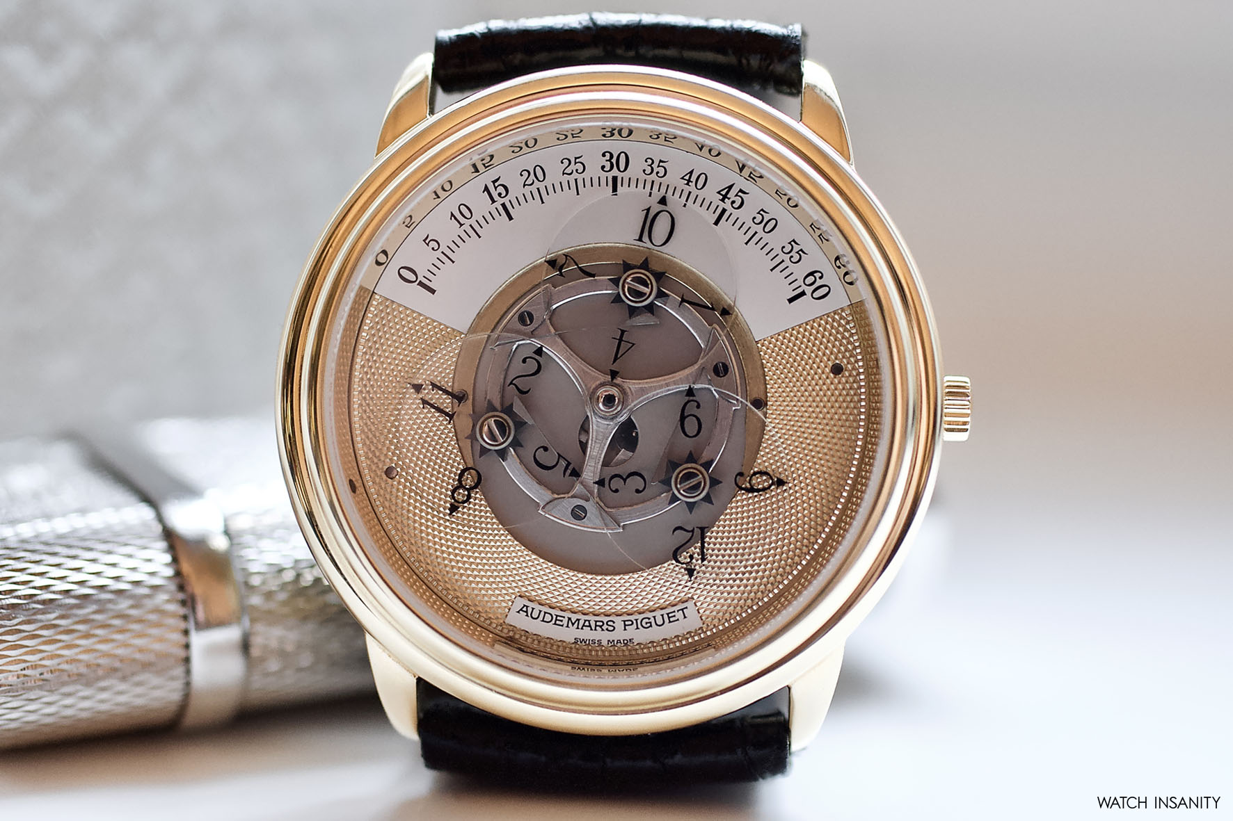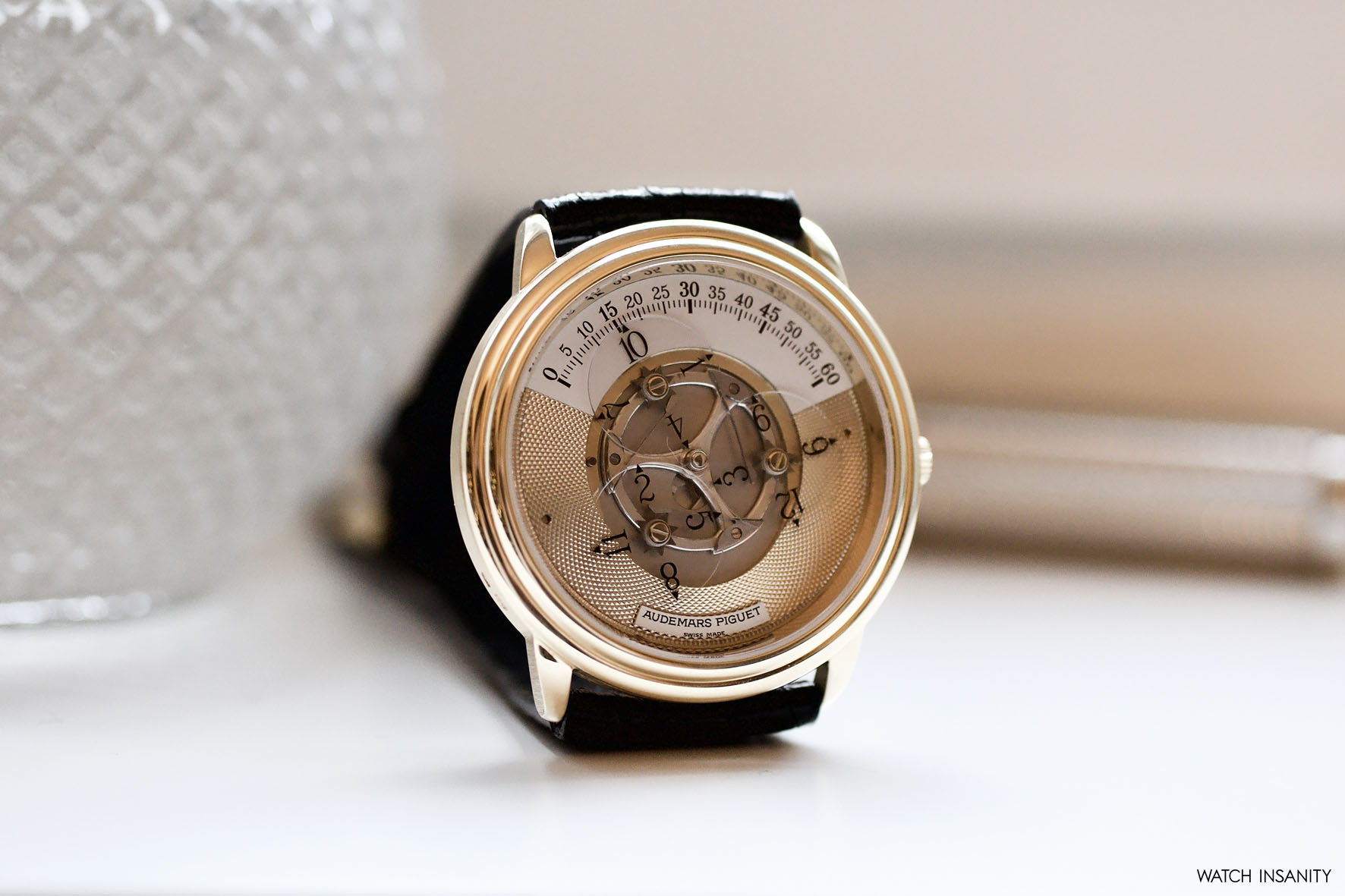The time display’s unique look is balanced out with the classic guilloché gold finish on the rest of the dial and the classically-shaped case. The first case was in 18k yellow gold, but some references are also made of platinum and stainless steel, and had a simple rounded but stepped bezel. Measuring 36mm in diameter and only 9mm thick, it has classic dress watch proportions which, together with the short lugs, make it very well wearable. The hand-cut and sewn leather strap and the 18k gold buckle with the Audemars Piguet engraving are typical of a high craftsmanship product of yesteryear, which has no problem blending in with formal attire.