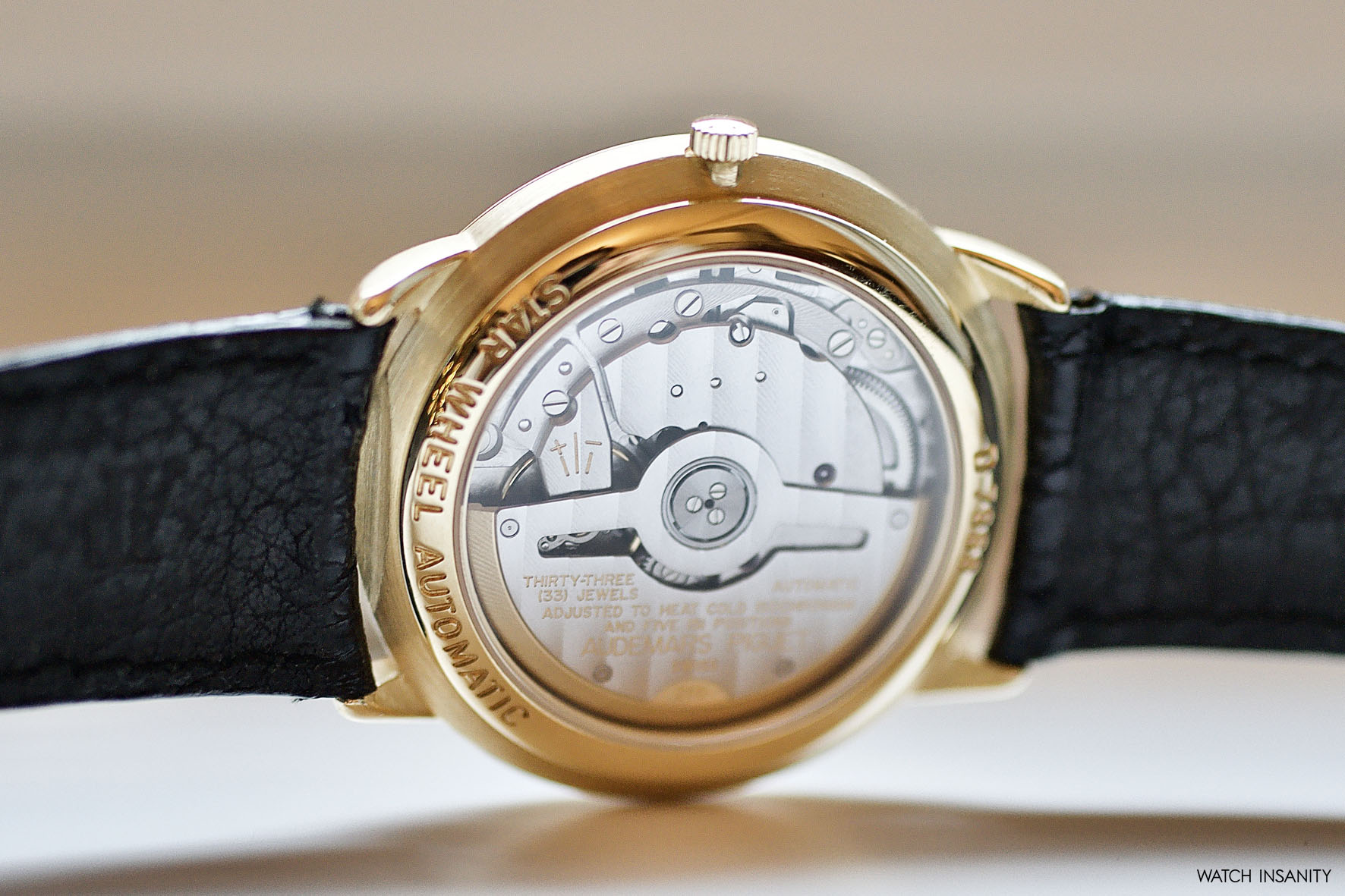 The movement that drives the Star Wheel is an automatic AP 2224/2811 caliber, developed by Audemars Piguet and based on the Jaeger-LeCoultre JLC 889/2 caliber with 28,800 vibrations/hour and a power reserve between 40 and 48 hours. The central oscillating weight is in 21k gold, visible through the transparent crystal sapphire caseback.