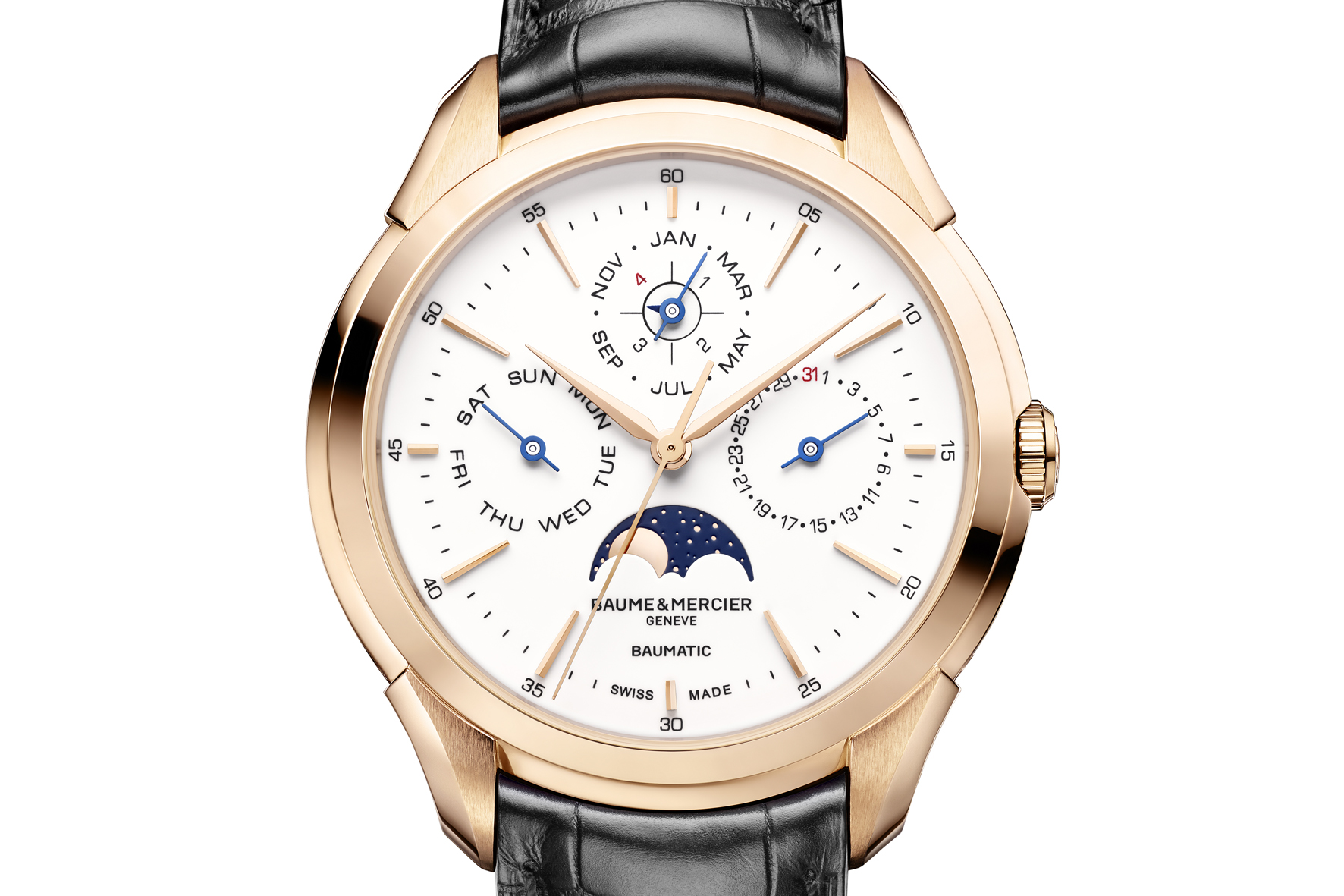 By indicating the date, the day of the week, the month and the phases of the moon while automatically taking into account the variable lengths of months and the leap year cycle, the Clifton Baumatic Perpetual Calendar deserves its place among the most complex watches with this complication. It requires no date correction before March 1st, 2100, a non-leap year.