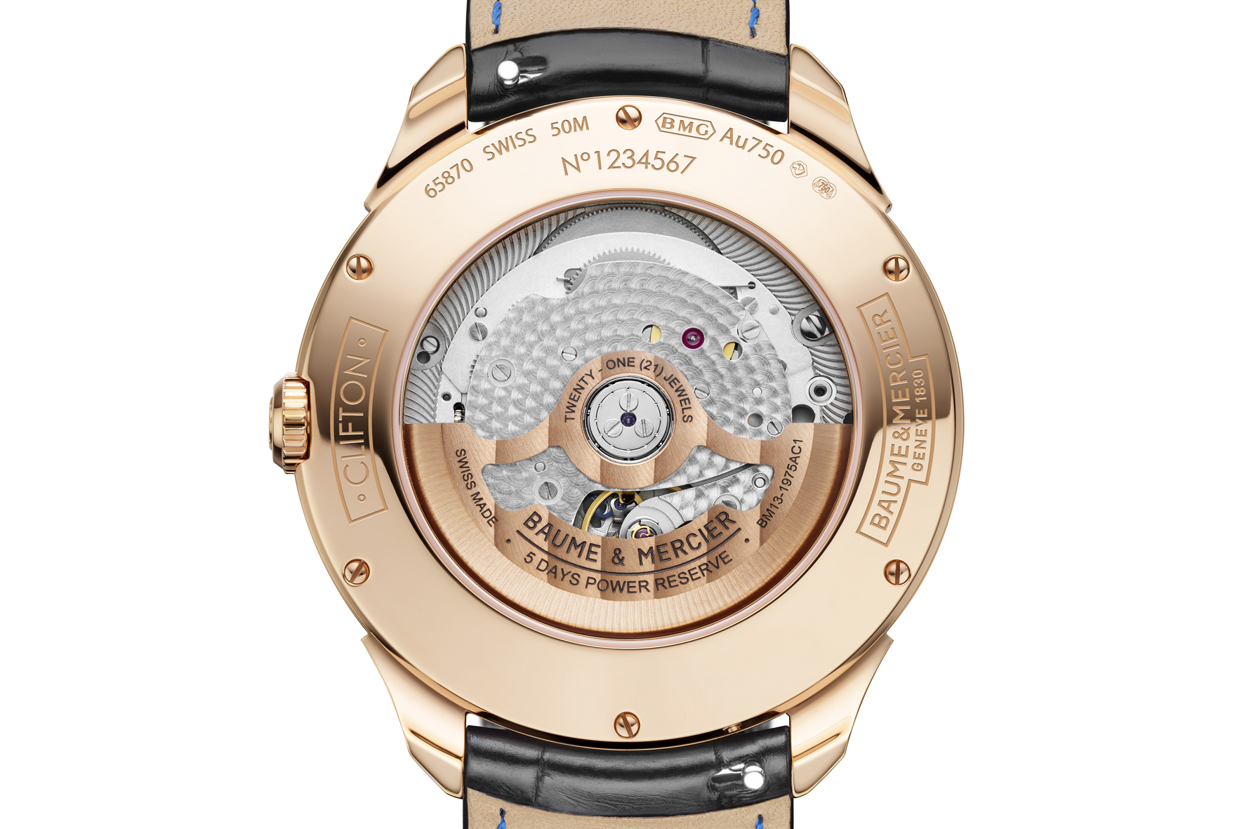 The 42 mm satin-finished 18K red gold case of the Clifton Baumatic Perpetual Calendar is just 12.1mm thick. The caseback is protected by a sapphire crystal that reveals the calibre’s refined finishes, such as the circular-grained bridges and the sand-blasted, snailed baseplate. The openworked, gold-plated oscillating weight is adorned with a decoration combining Côtes de Genève with snailing.