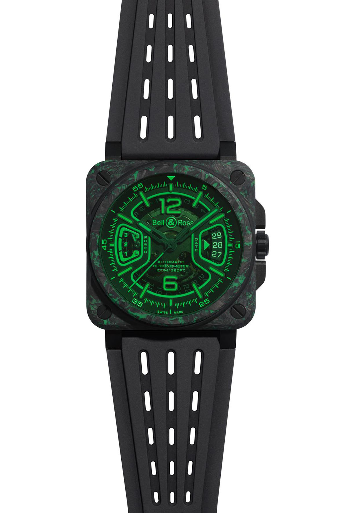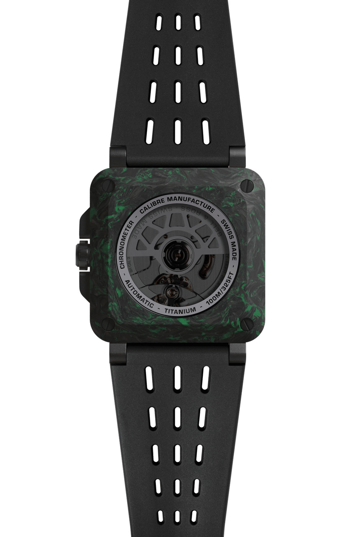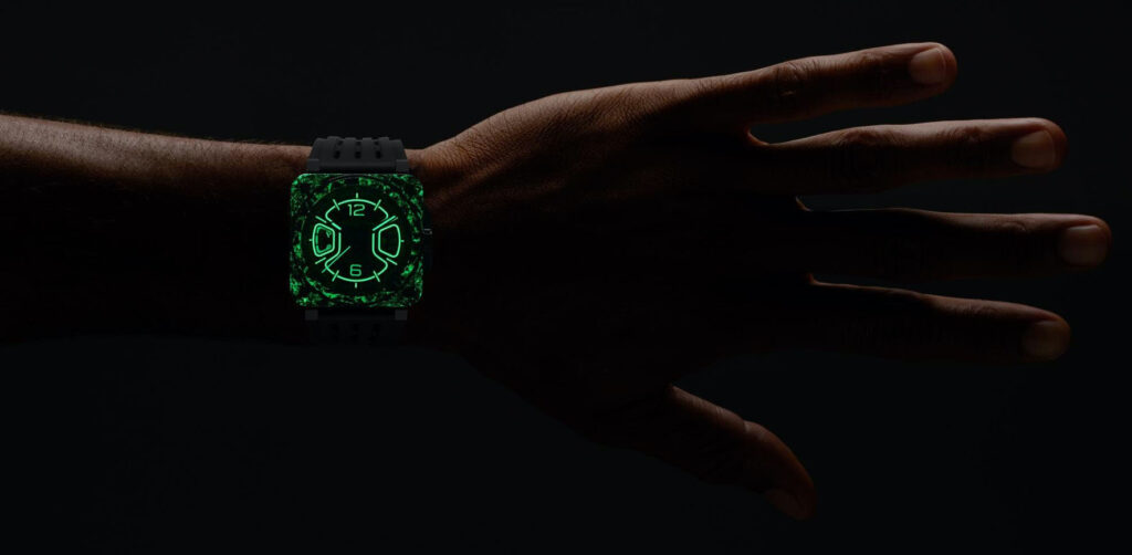 Sophisticated and technical, the 41 mm case of the new BR-X3 line features a multi-component, multi-material “sandwich” construction. This design ensures maximum robustness. The two main plates on the BR-X3 Night Vision, are crafted in LUM-CAMO, an high-tech composite combining carbon fiber with a blend of SLN resin. The plates are fastened with four through-screws housed in protective cylinders. For this special edition, the cylinders are made of green rubber, also photoluminescent, enhancing the watch’s visual properties in darkness far beyond the display of time. The middle case, set between the two plates, is in titanium coated with black PVD.