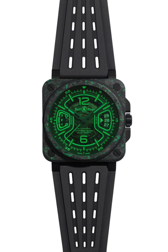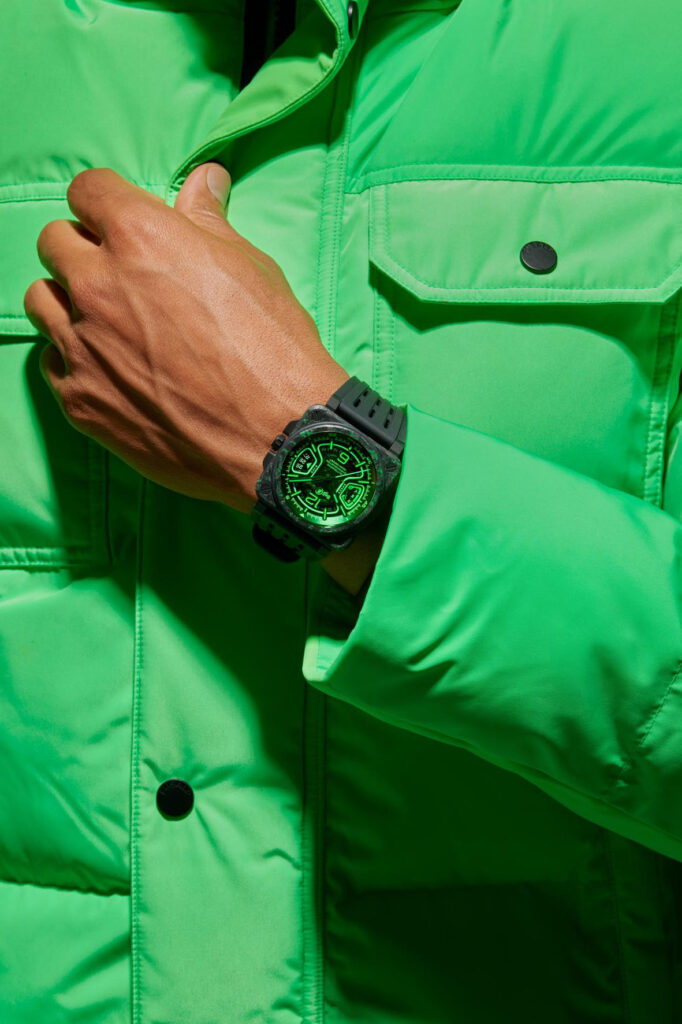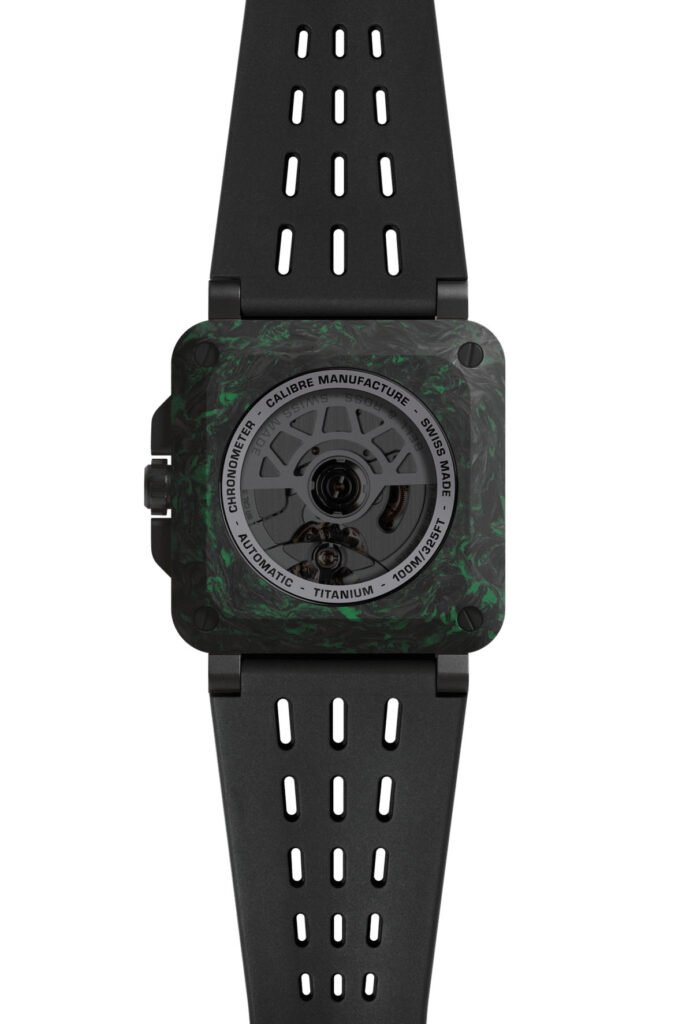 Applied to the tinted glass, the photoluminescent green-highlighted cutout pattern is topped with a green-tinted sapphire crystal. The open worked dial gives the watch a highly technical look while showcasing the manufacture automatic movement. On the case back, a green-tinted sapphire crystal reveals the calibre, with its specifically decorated oscillating weight. Notably, the cutout edges—including the 70-hour power reserve indicator and the large date window—are also outlined in green Super-LumiNova. This photoluminescent material is also applied to the numerals, indexes, and hands. Beyond its exceptional nighttime legibility, the dial offers a bold, graphic interpretation of luminescence. A visual signature of the BR-X3, the whole design immerses us into the heart of a cockpit or the darkness of an aerospace control centre.