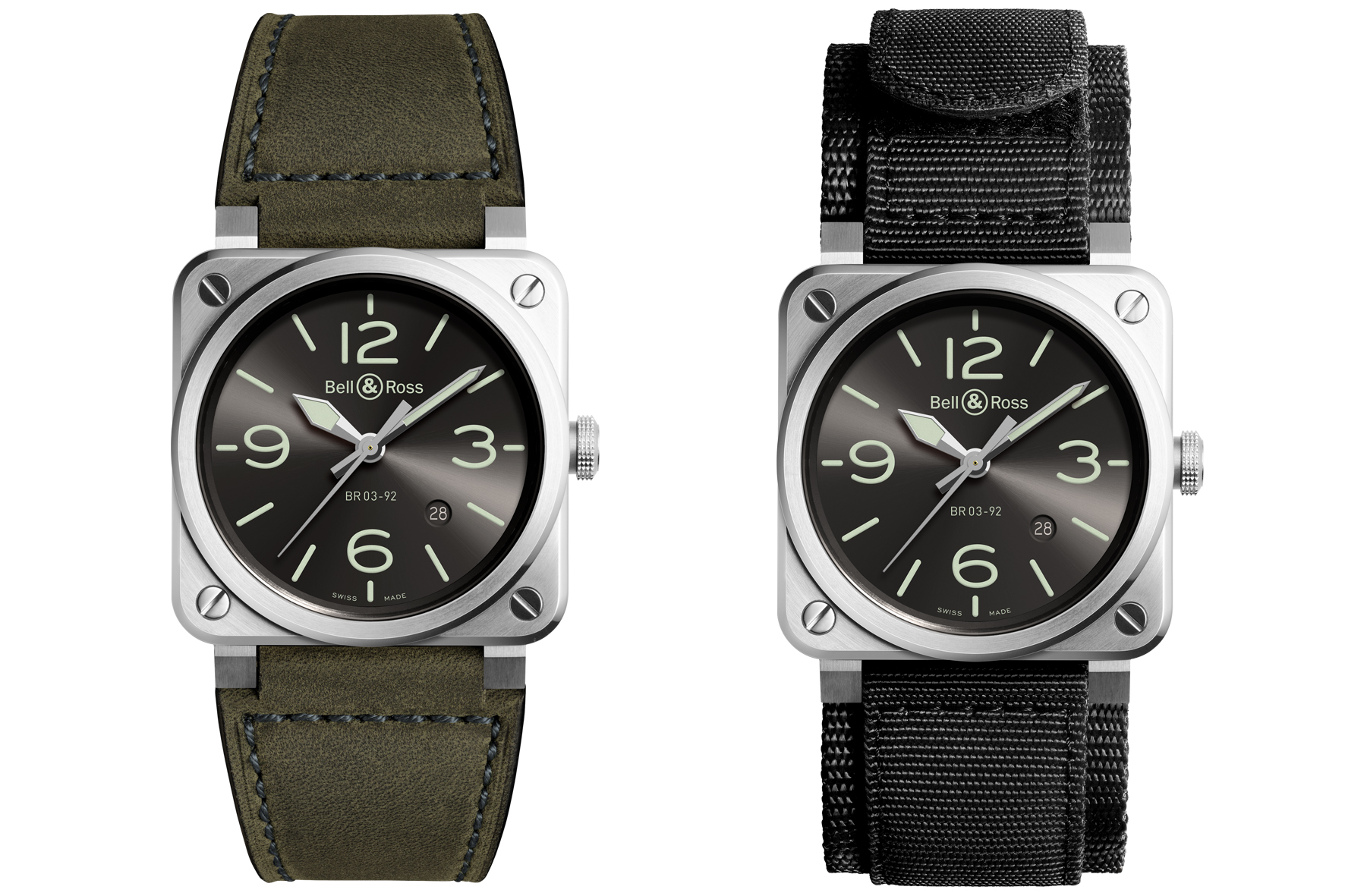 The new BR03-92 GREY LUM is equipped with two straps, a grey‐green velvet calfskin strap, reflecting the green colours of the SuperLumiNova C3 treatment and a strap made from ultra‐resilient fabric and black Velcro. (Price € 2.990)