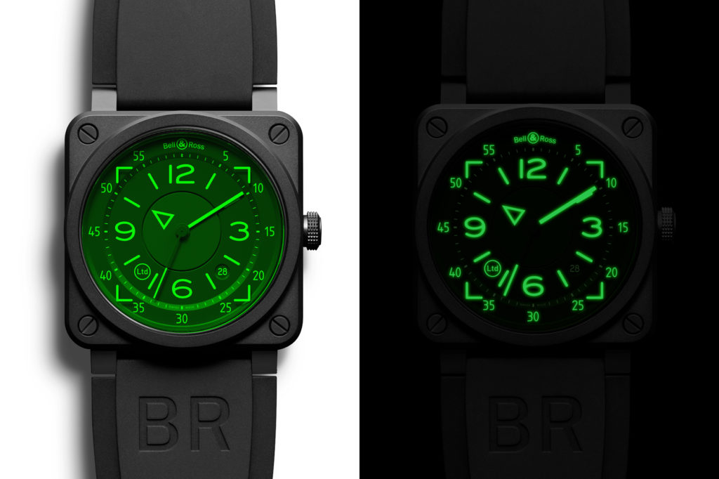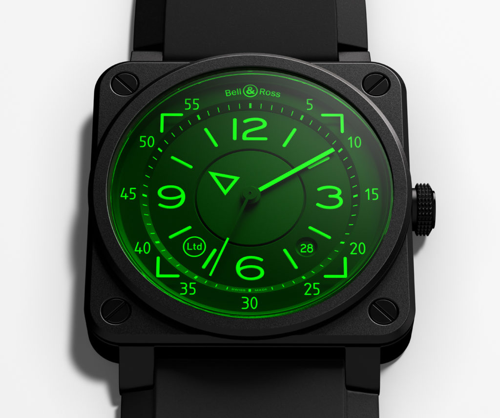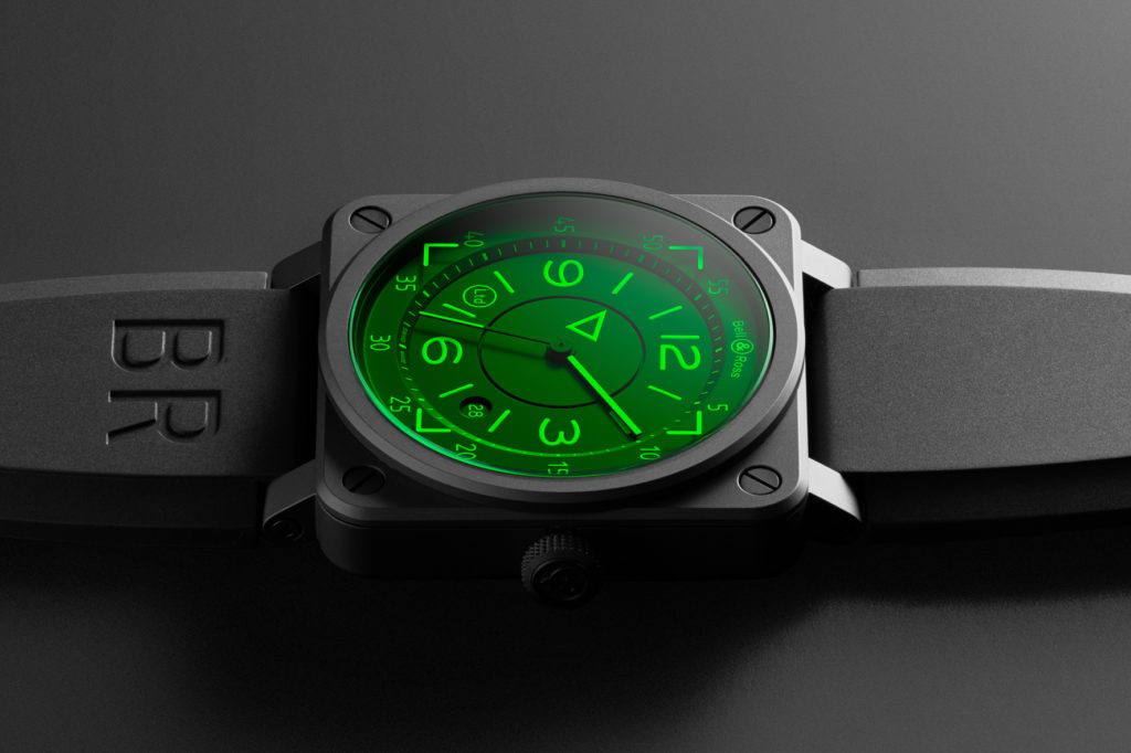 By using the green color, Bell & Ross recreates the graphic style of this Instrument as closely as possible. The green on the dial mirrors the «computer- type» display of the HUD, and the cases anti-reflective matte black background provides a striking contrast. The sapphire crystal is tinted and obtained through a green pigment coating technique that is applied on its underside.
