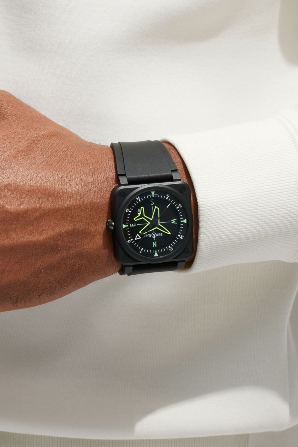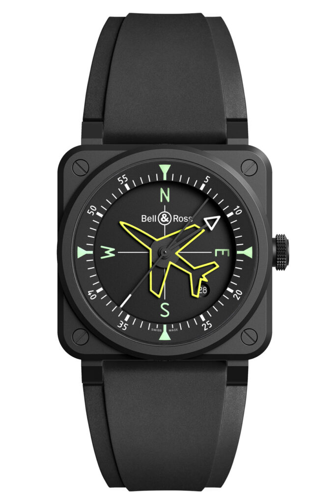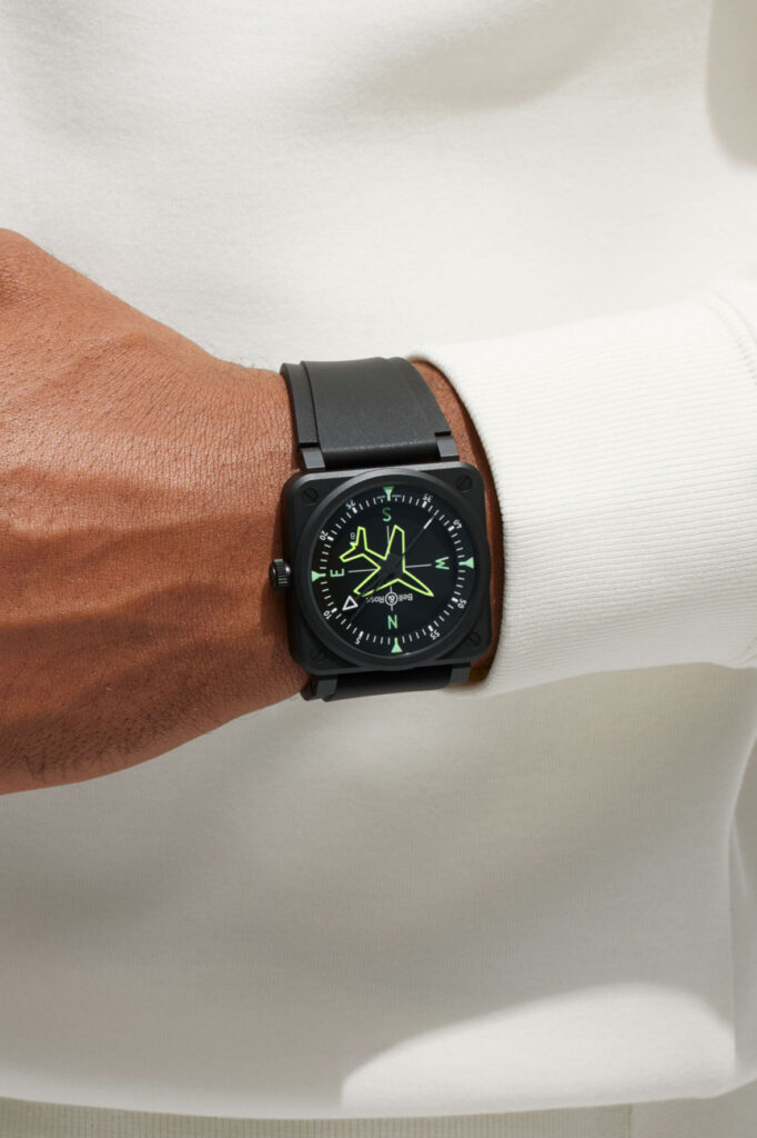 The BR 03 family is a central pillar in the Bell&Ross collections. Since launching in 2006, the concept has showcased the watchmaking Maison’s full capability: taking the indicators of an aircraft dashboard and reinterpreting them for the wrist. Reinvented this year in new proportions, the iconic rounded square shape of the BR 03 range now comes in a 41mm case. Also available in this new size, the BR 03 Gyrocompass has a black ceramic case just 10.6 mm thick and waterproof to 100 metres. A robust finish inspired by aeronautical equipment, the black rubber strap fastens with a steel pin buckle with black PVD coating, underlining the professional dimension of the limited series watch of 999 pieces.