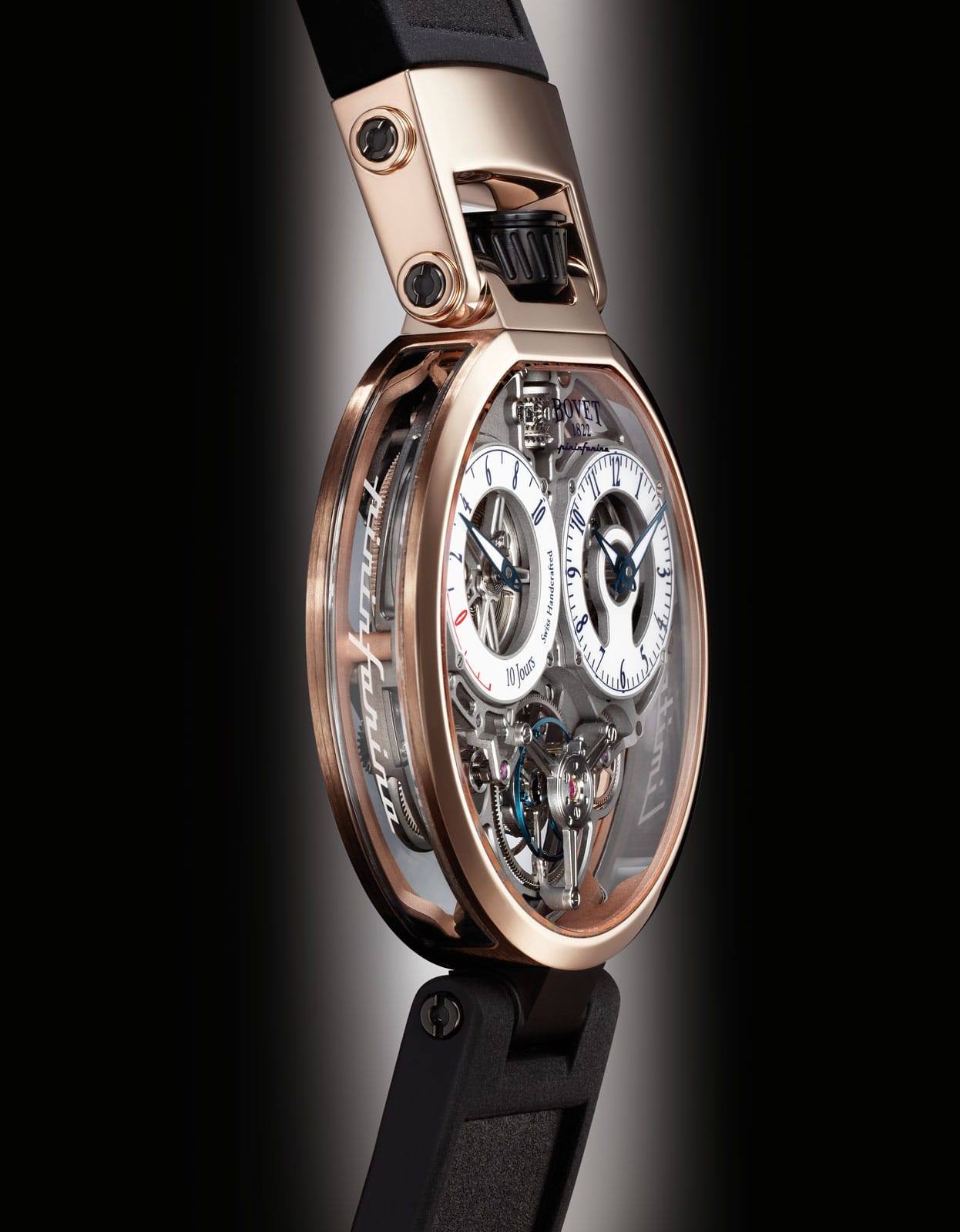 The technicians and watchmakers at the Manufacture DIMIER 1738 together with the designers at Pininfarina pooled their expertise to come up with an unprecedented perspective on the originality and fascinating technology inherent to the movement, once again entirely developed and manufactured by BOVET. Four large sapphire crystals occupy the main surfaces, while contrasting elements in titanium or gold trace the essential contours of the collection’s design and guarantee the qualities required for its sportier traits.