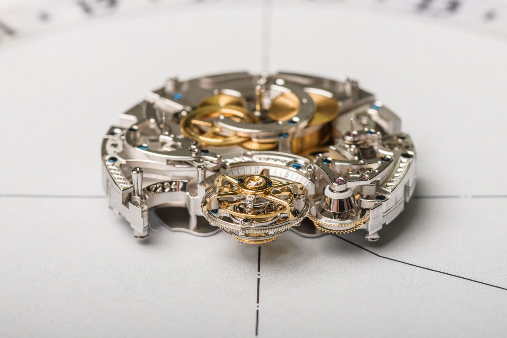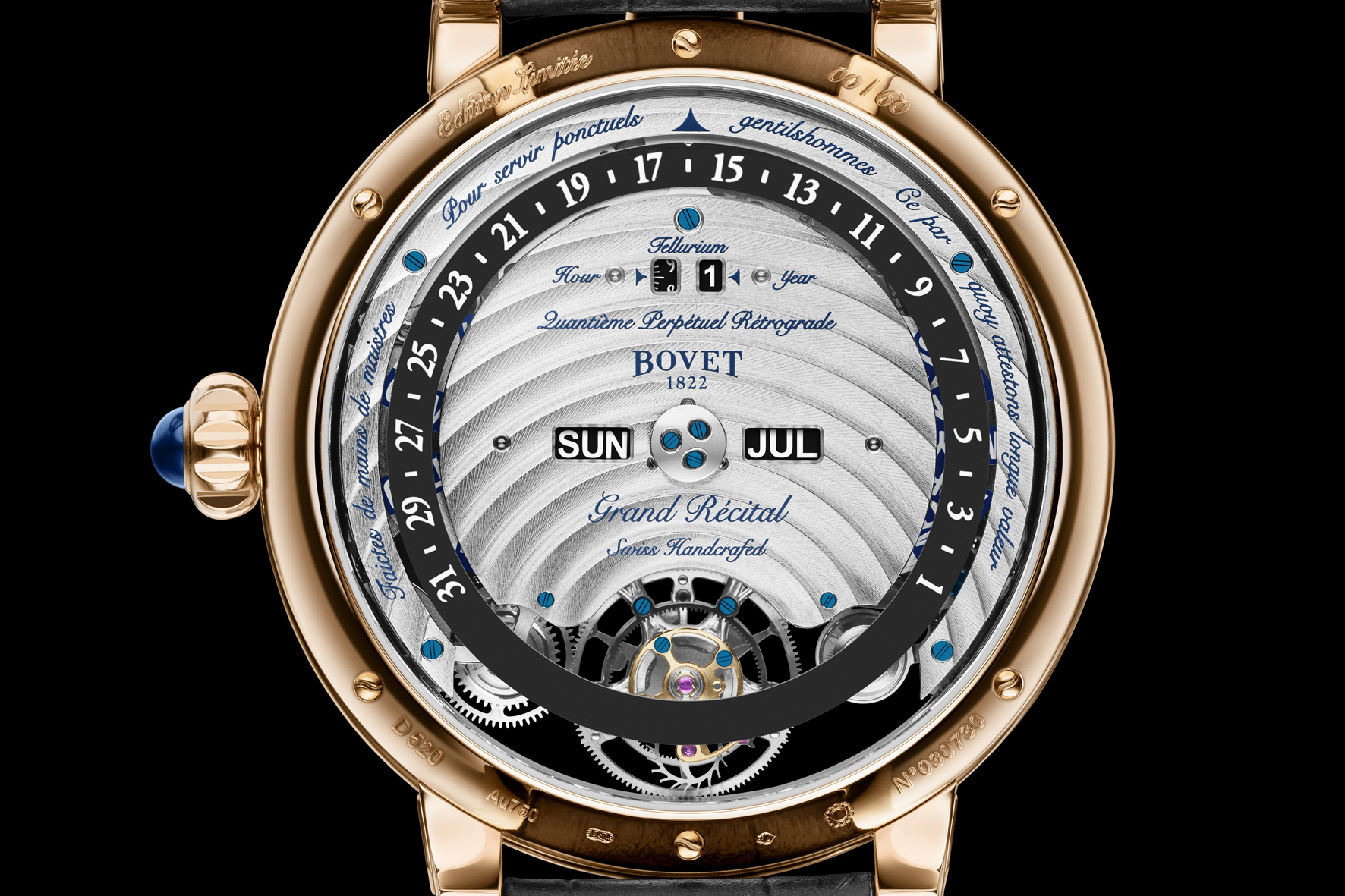 Reversing the timepiece and looking through its large sapphire crystal, the viewer beholds a vast bridge decorated with circular Côtes de Genève, centered around the tourbillon’s axis.Various apertures open onto the hour, day, month, and leap-year indicators, and a glass date disk guided by the bridge, which is displayed on both sides of the movement. This combination of indications acts in concert as a sort of mechanical brain that governs the perpetual calendar. This decision ensures optimum accuracy in the display and setting of the time reading and all the Tellurium functions.