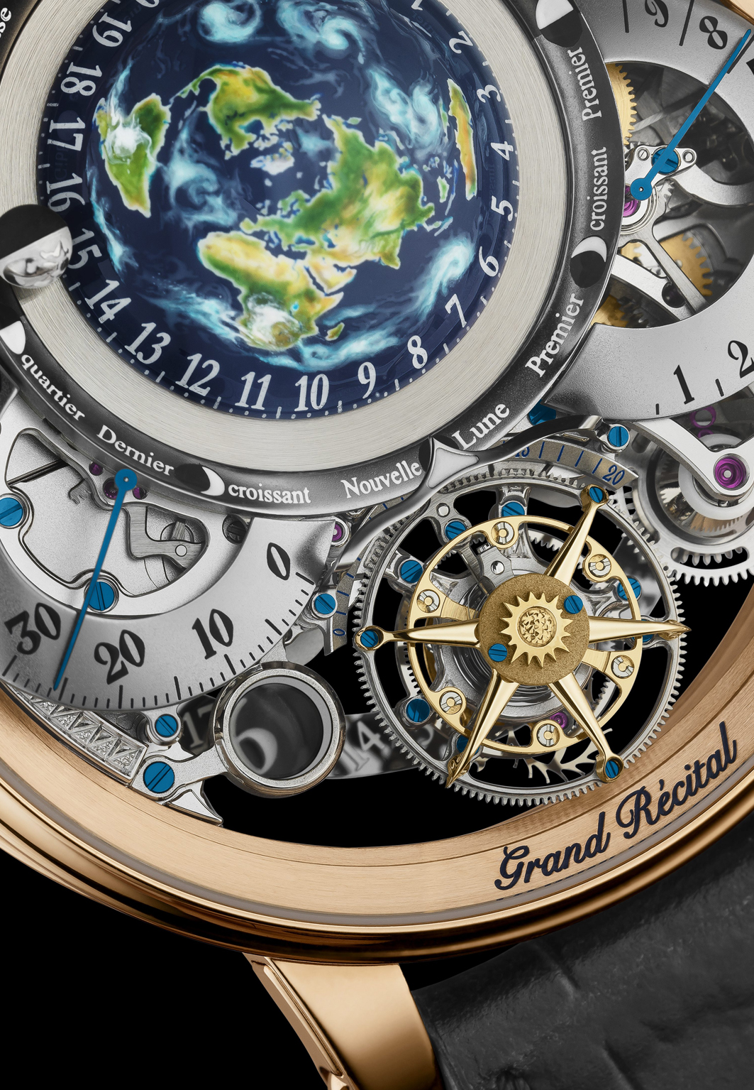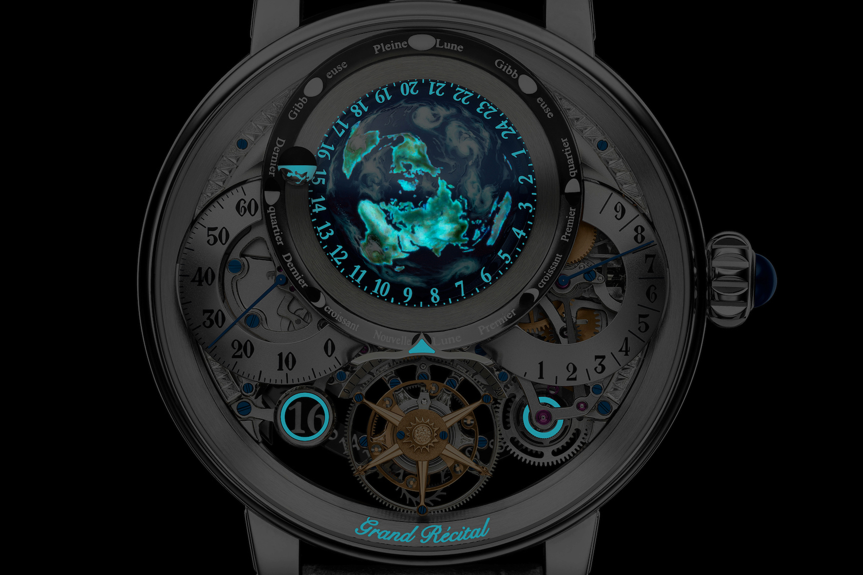 The moon is represented by a sphere that makes a complete orbit once every 29.53 days exactly, which corresponds to the synodic period of our natural satellite. The high-precision mechanism that powers the moon and moon phase display, also visible on the Earth’s concentric ring, means that it will register a discrepancy of just one day every 122 years. The sphere is divided into two parts: one black, while the second is engraved with the textured surface of the moon. The engraved sections of the second half are filled with a luminescent substance, which makes it possible to clearly see which part of the moon is directly illuminated by the Sun. This rare combination of indications is the subject of one of the five patents protecting the movement of the Grand Récital.
