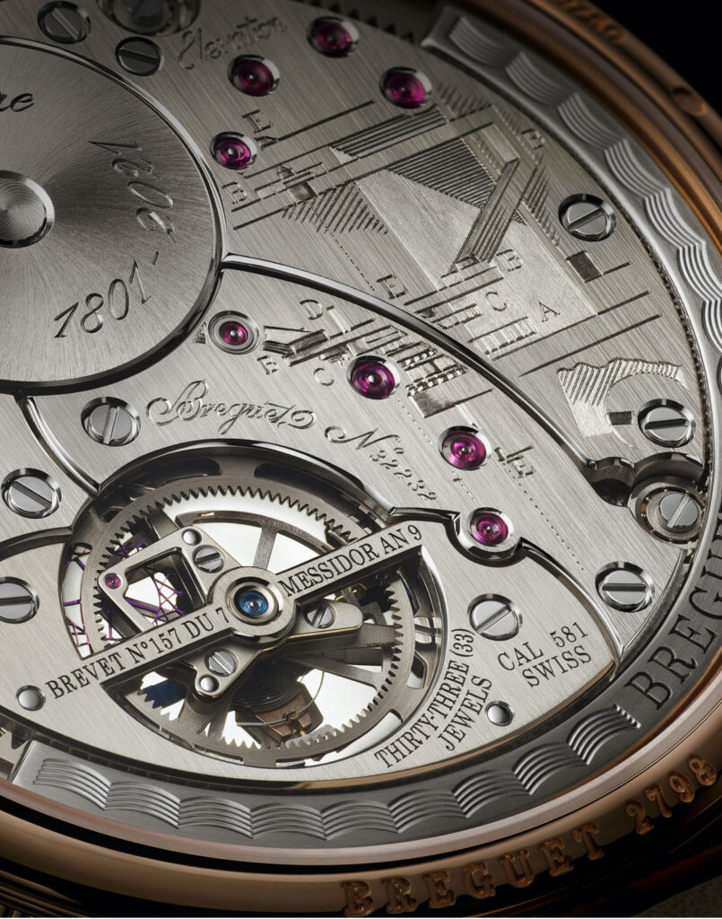 The same can also be said of the various engine-turned motifs adorning the gold dial. As well as becoming one of Breguet’s aesthetic hallmarks, engine-turning, also known as guillochage, possesses very specific watchmaking features. By offering surfaces with finely worked irregularities, the technique allows light to be captured in a variety of ways, ranging from the utmost clarity to a more matte finish. Light captured in this way enables the different reading zones on the dial to be clearly marked. Engine-turned surfaces are also better protected from the ravages of time than a polished finish, which are overly shiny and prone to corrosion and scratches. Finally, engine-turned surfaces offer the relief needed in order to collect the microdust that could have degraded the chronometric performance of the first pocket watches more than two centuries ago.