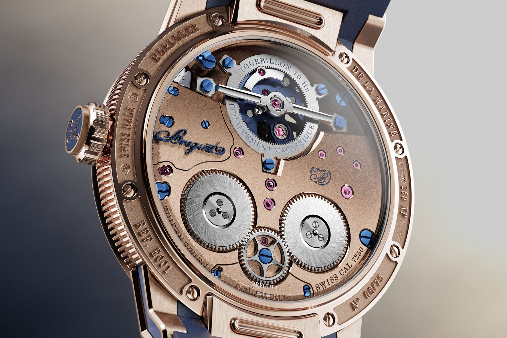 This device features two escapement wheels, each equipped with a magnetic track, at the centre of which operates a lever with magnetic pallets—a system inspired by constant-force escapements. Below a certain torque threshold, the tourbillon stops rapidly; above it, the balance wheel oscillates at its maximum amplitude. The escapement developed by Breguetalso allows the impulses transmitted to the balance wheel to be decoupled from the rotation of the escapement wheel and, therefore, from the rest of the gear train. Between the two escapement wheels with magnetic tracks, an intermediate stop wheel prevents unwanted jumps. Furthermore, most of the other components of the tourbillon are non-magnetic, in order to avoid interference that could compromise smooth operation.