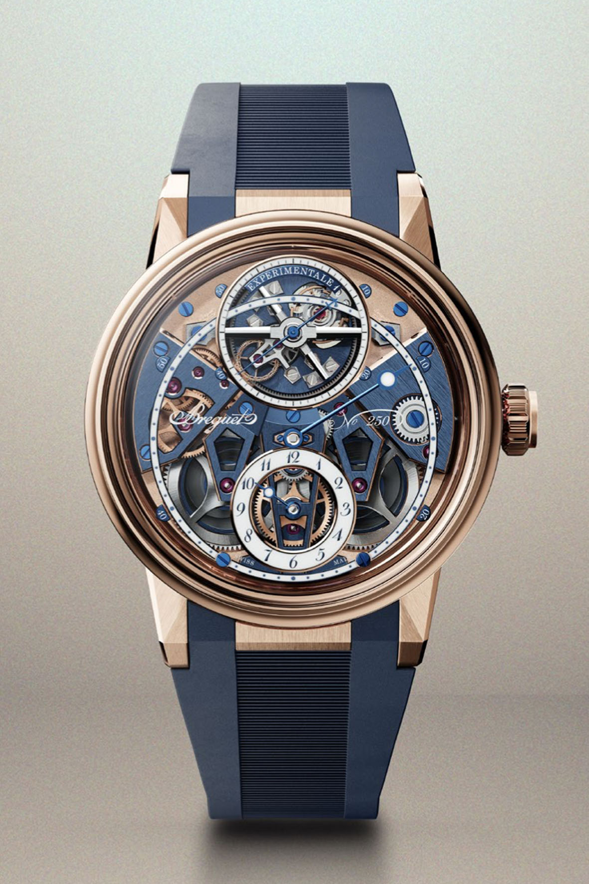 The Breguet Expérimentale 1 retains its modern, avant-garde character with a blue rubber strap seamlessly integrated into the case and fitted with a quick-release system operated by buttons on the reverse of the lug modules. It is secured by an 18-carat Breguet gold pin buckle, ensuring comfort despite the watch’s substantial dimensions.