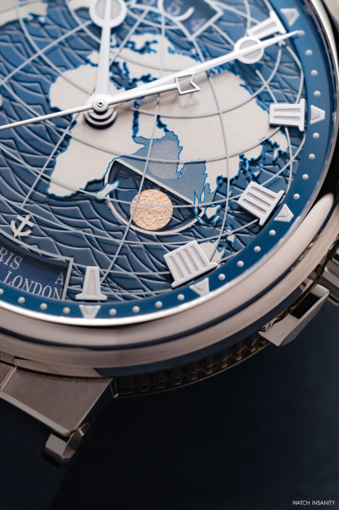The other major effort spent on the Breguet Hora Mundi concerns the dial. When it was designed, the aim was to create a 3D effect, a sense of depth. In addition to realism, Breguet also wanted to make the dial easy to read, and to achieve this, the designers played on the superimposition of different plates. The first, made of gold, consists of hand-worked waves with a blue guilloché motif and features a soleil machining, the effect of which gives the impression that the waves are moving, as a real sea. Subsequently, an additional sapphire plate shapes the meridians. The continents, on the other hand, have a horizontal satin treatment and their ribs are subtly outlined by a metallic turquoise border. Finally, an external grid encloses the various elements on the dial. The result is a watch with perfectly executed dimensions and surfaces, thanks to various treatments, each of which took several weeks to complete.