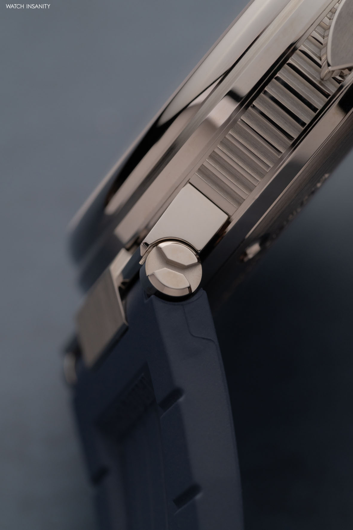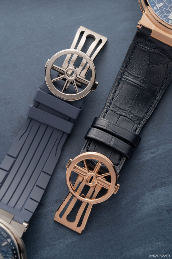 Screwed to these lugs is the strap, which can be in structured blue rubber with a white or pink gold triple folding clasp, or in alligator, also blue. The most precious versions, on the other hand, include a bracelet, in white or pink gold, characterised by a beautiful satin finish in continuity with that of the lugs. The satin finish, however, only affects the upper part of the links, while the sides are polished. This alternation creates interesting plays of light, and is further proof of the maniacal attention paid by Breguet to the creation of the Marine Hora Mundi. As is understandable, the presence of bracelets and straps influences the watch’s final price: it ranges from 89,100 euros for the versions with rubber or alligator straps – in both white and pink gold – to 118,000 euros for the two bracelet versions.
