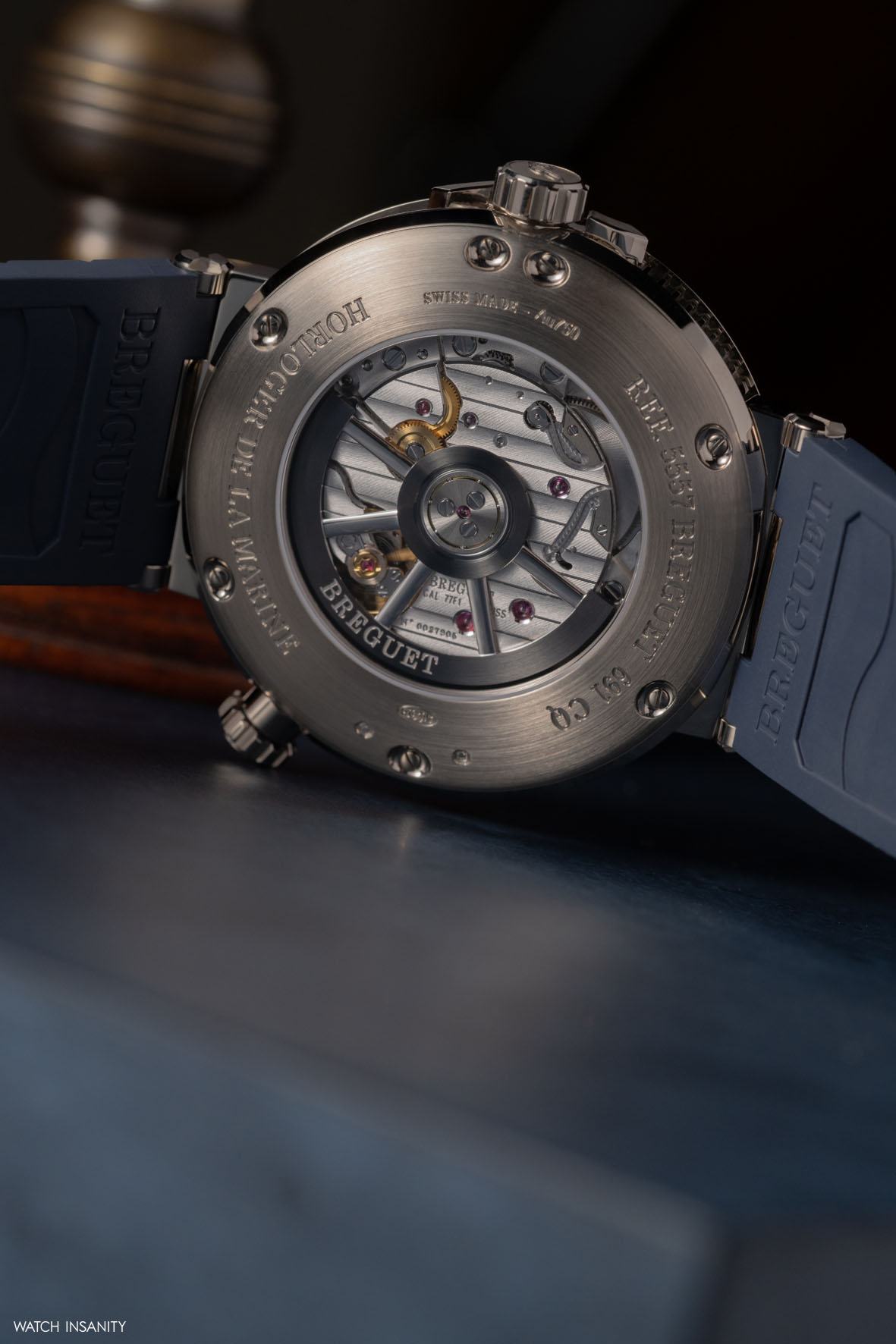 The calibre 77F1 driving the Breguet Marine Hora Mundi is visible through the sapphire crystal case back and is state-of-the-art in the Maison’s technology, thanks to its patented add-on modules: dual-time-zone mechanism, second-time-zone display, reprogrammable memory mechanism and day/night hand display. The movement operates at 28,800 vibrations per hour (4 Hz), has a silicon escapement wheel and balance spring, thus a-magnetic, and 55 hours of power reserve. In keeping with the Breguet tradition, it is finished to a very high standard, from classic Côtes-de-Genève to guillochage decoration.
