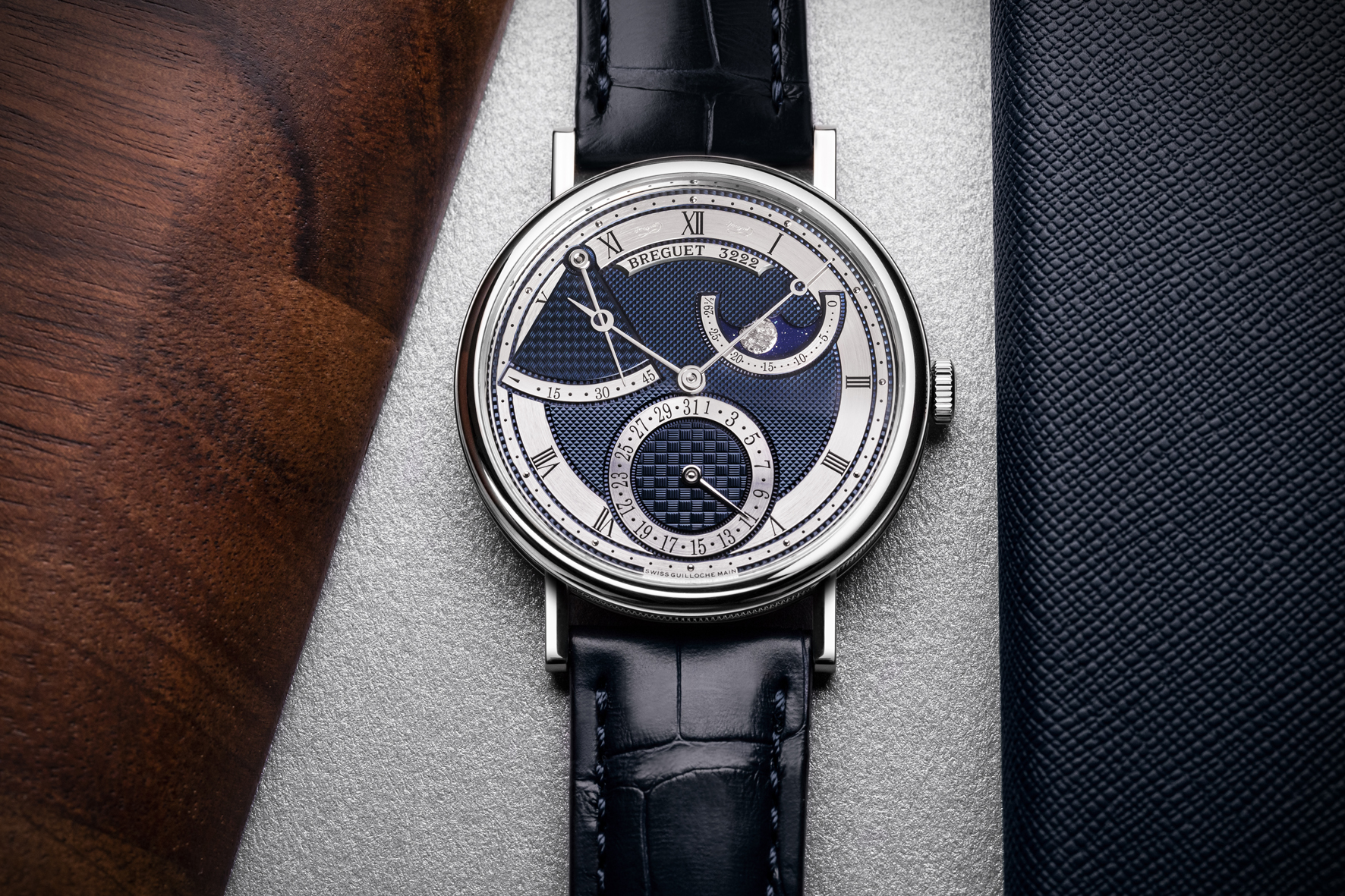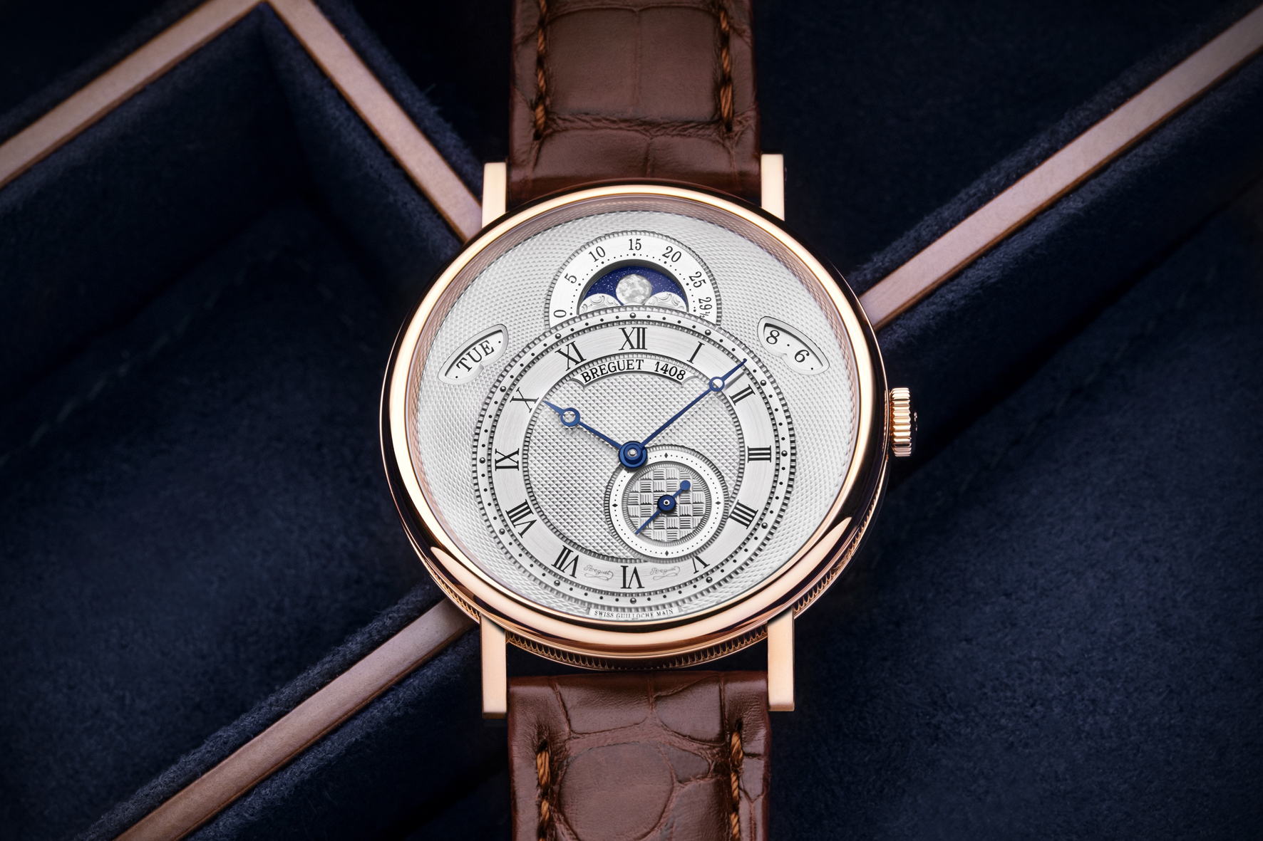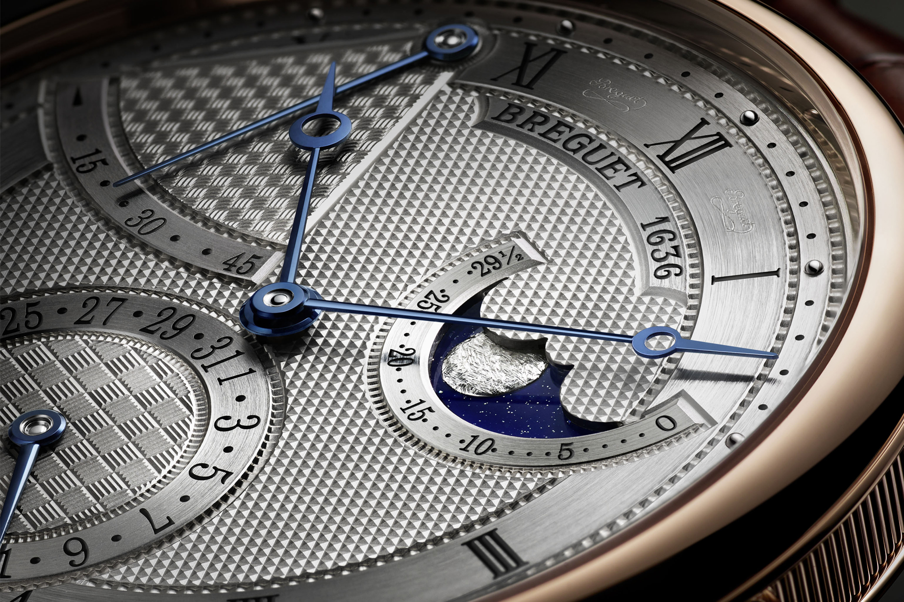 The Classique 7137 features a gold dial with panier maillé basket weave pattern for the power reserve display between 10 and 11 o’clock, a damier checkerboard pattern for the date display at 6 o’clock and a clous de Paris hobnailing pattern for the main part of the dial. Moon phases and age indicator are at 2 o’clock. The dial of the white gold version is in Breguet blue color. In the rose gold version, the dial color is created using silver powder and a soft brush.