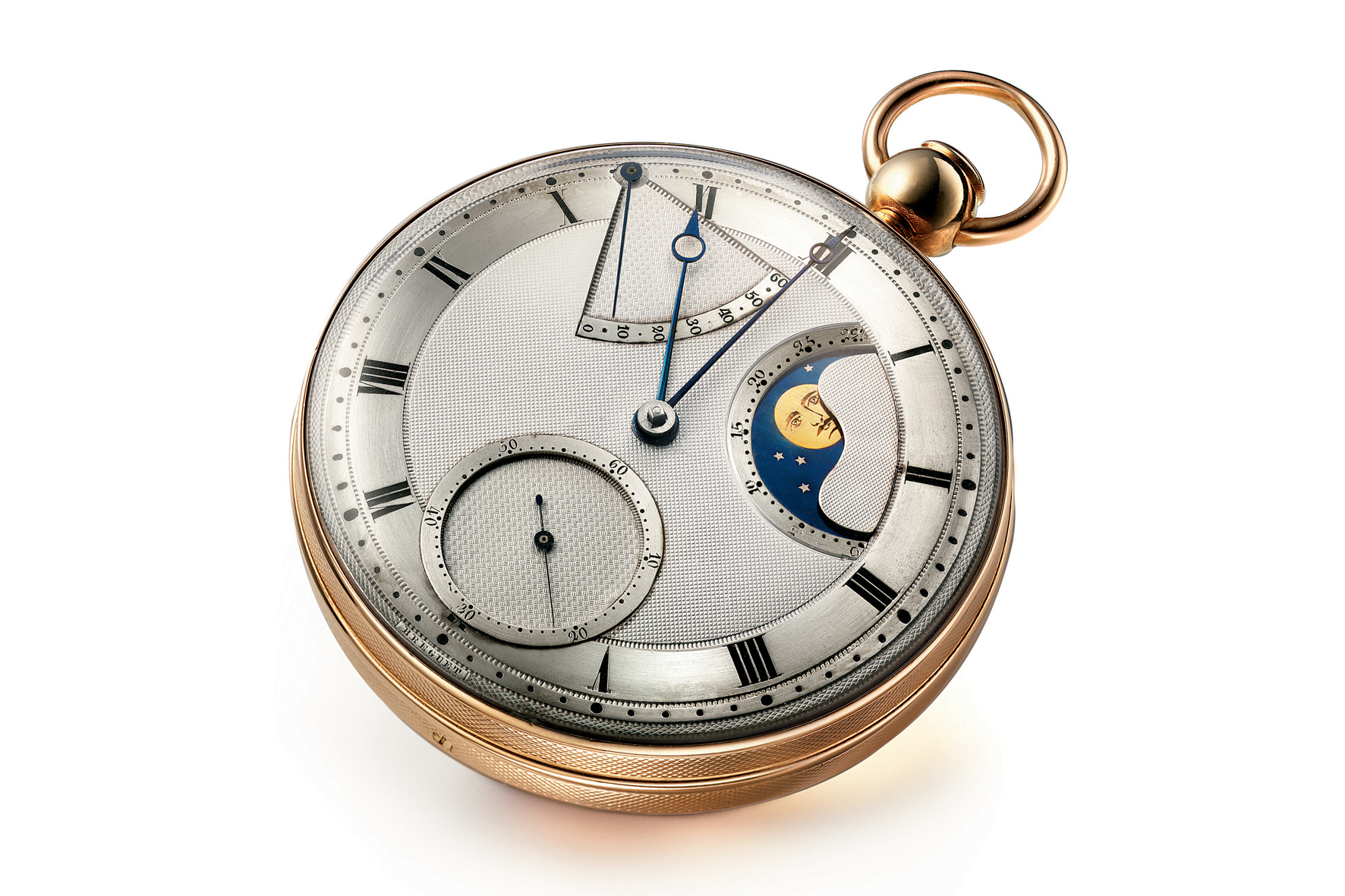 The dial of the Classique 7337 features delicate patterns: circular grain d’orge barley grain for the edges of the hours chapter, damier checkerboard for the small seconds at 5 o’clock and Clous de Paris hobnailing in the center. Engraved clouds bordering the lacquered sky of the moon-phase indicator at 12 o’clock, dotted with sparkles, are evocative of the Milky Way. Breguet has remodeled the golden disc depicting the moon in shiny relief and matte grooves. At 10 o’clock and 2 o’clock, two apertures, with shapes reminiscent of those of historic models such as pocket watch No.3833, show the day and the date.